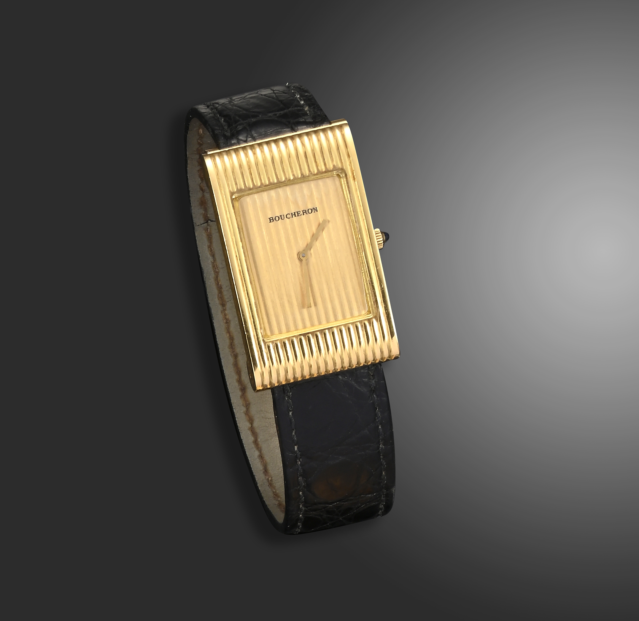 A yellow gold Reflet wristwatch by Boucheron, the fluted watch with signed plain conforming dial, quartz movement, the reverse signed and numbered 908247, with French control marks and 76981 2.2cm wide, black leather band signed Boucheron and Boucheron slide-action attachment