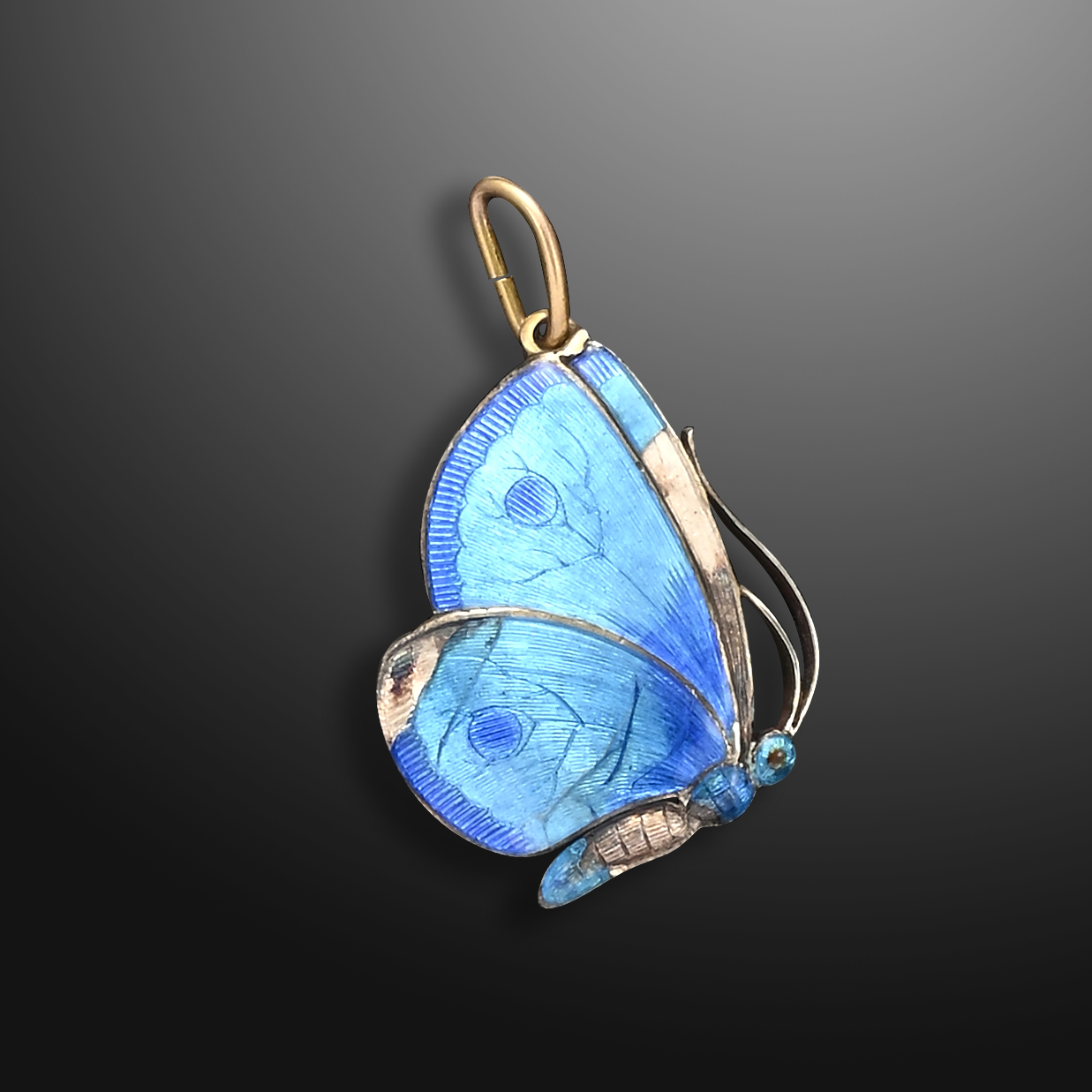A silver gilt and enamel butterfly pendant by Child & Child, the wings in two-coloured blue guilloche enamel (damaged), on a silver gilt backing, signed to the reverse with maker's mark, 3.5cm high including bale, case by Child & Child