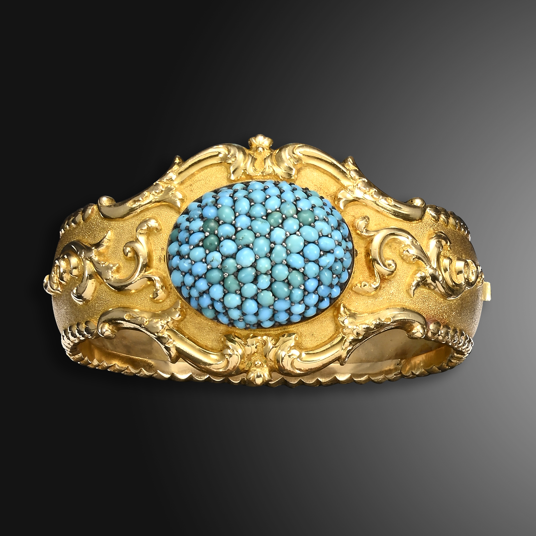 A Victorian turquoise-set gold hinged bangle, the oval bombé plaque is pavé-set with cabochon turquoise within gold scrolling and textured gold surround, 5.5cm inner diameter