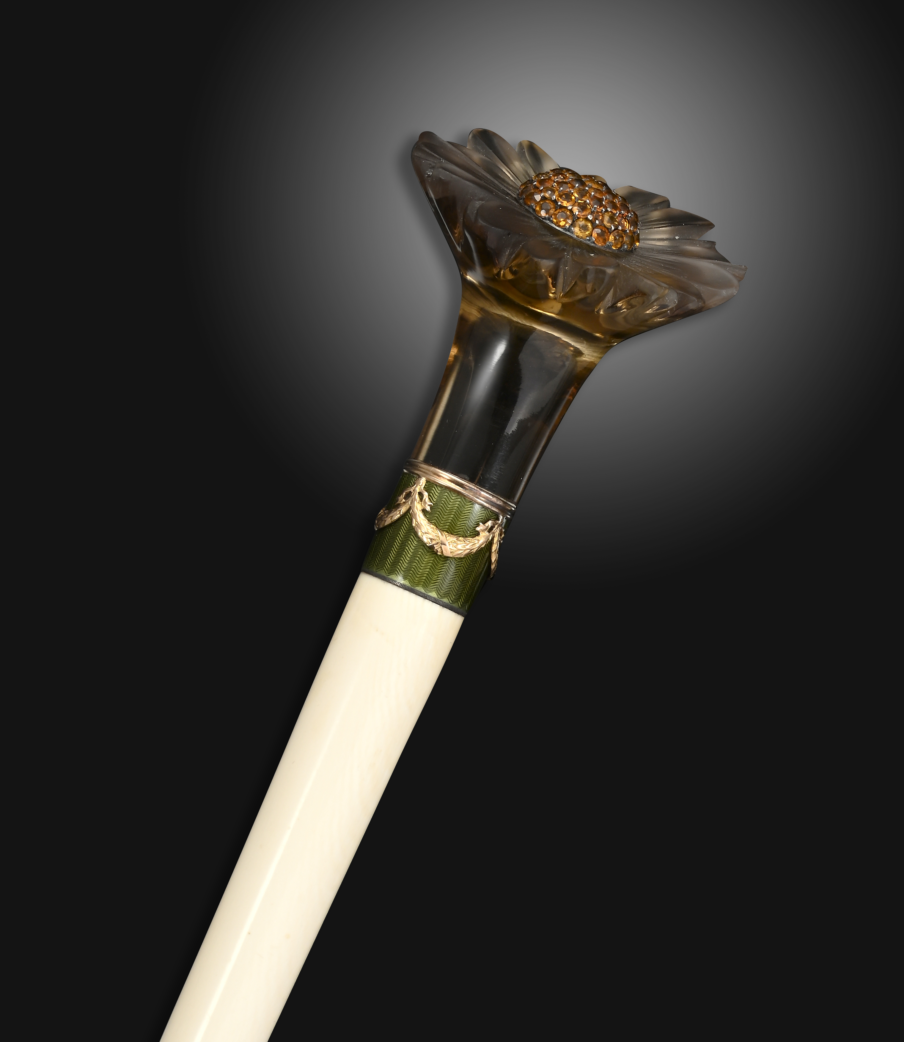 ‡ An ivory baton with carved smoky quartz engraved foliate handle, (probably Russian, early 20th century), centred with a domed circular cluster of gold and topaz, joined to a tapered ivory baton with an olive-green guilloche enamel band with gold swags, the flowerhead 5.3cm wide, 38.5cm long, in fitted hollywood case stamped with Imperial double-headed eagle to the silk lining