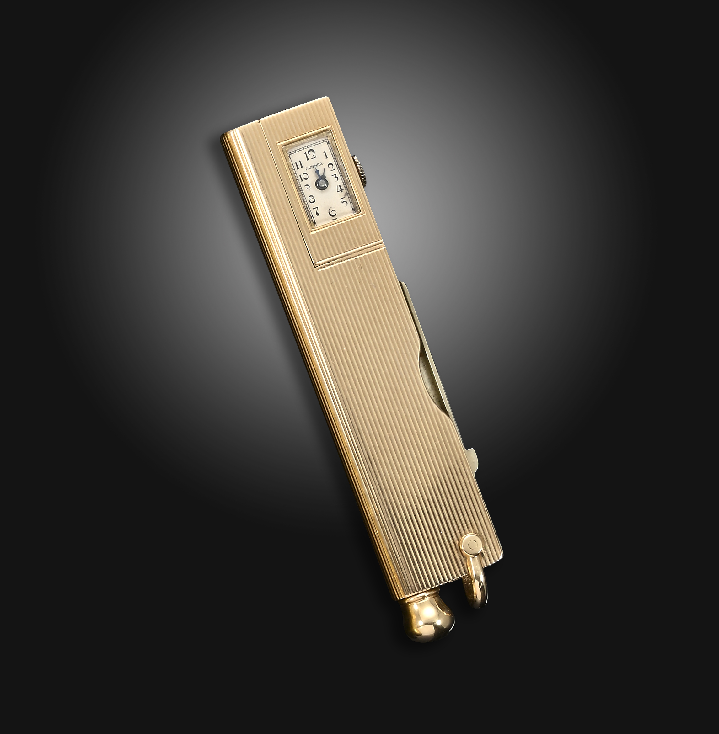 A striated gold rectangular pendant, incorporating a small manual-winding clock, dial signed 'Dunhill', with Arabic numerals, a penknife, key and striated gold propelling pencil, folding gold suspension loop, 7cm long (probably 1950's and stamped 14K) with a small brush and associated Dunhill box, engraved with the initials RHB