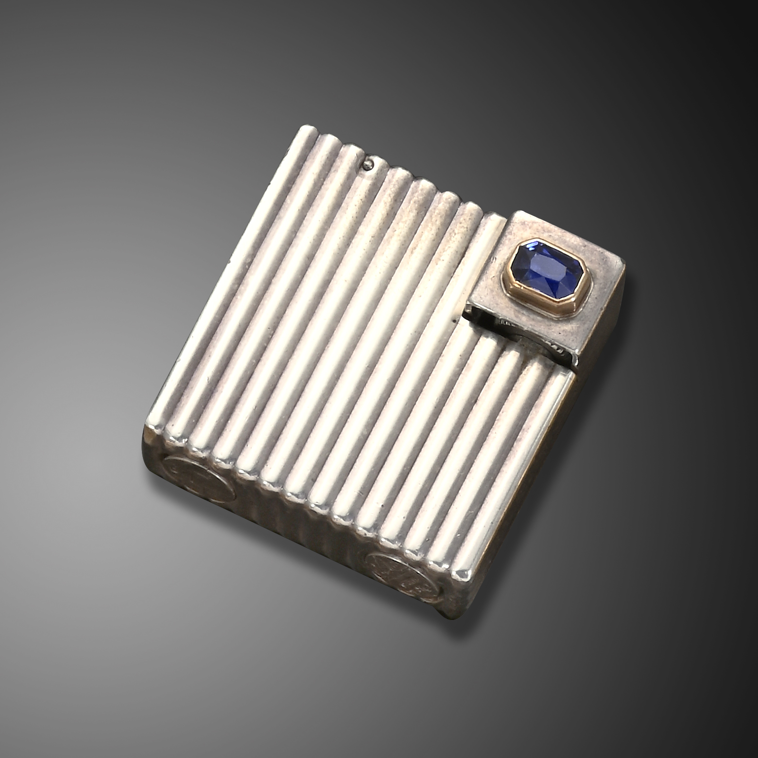 A silver lighter by Cartier, with fluted silver case, the flip-top cover set with a rectangular-cut blue stone in gilt collet, signed 'Cartier Paris, Depose', French control mark, maker's mark for Louis Pebaumas, 3,4cm high