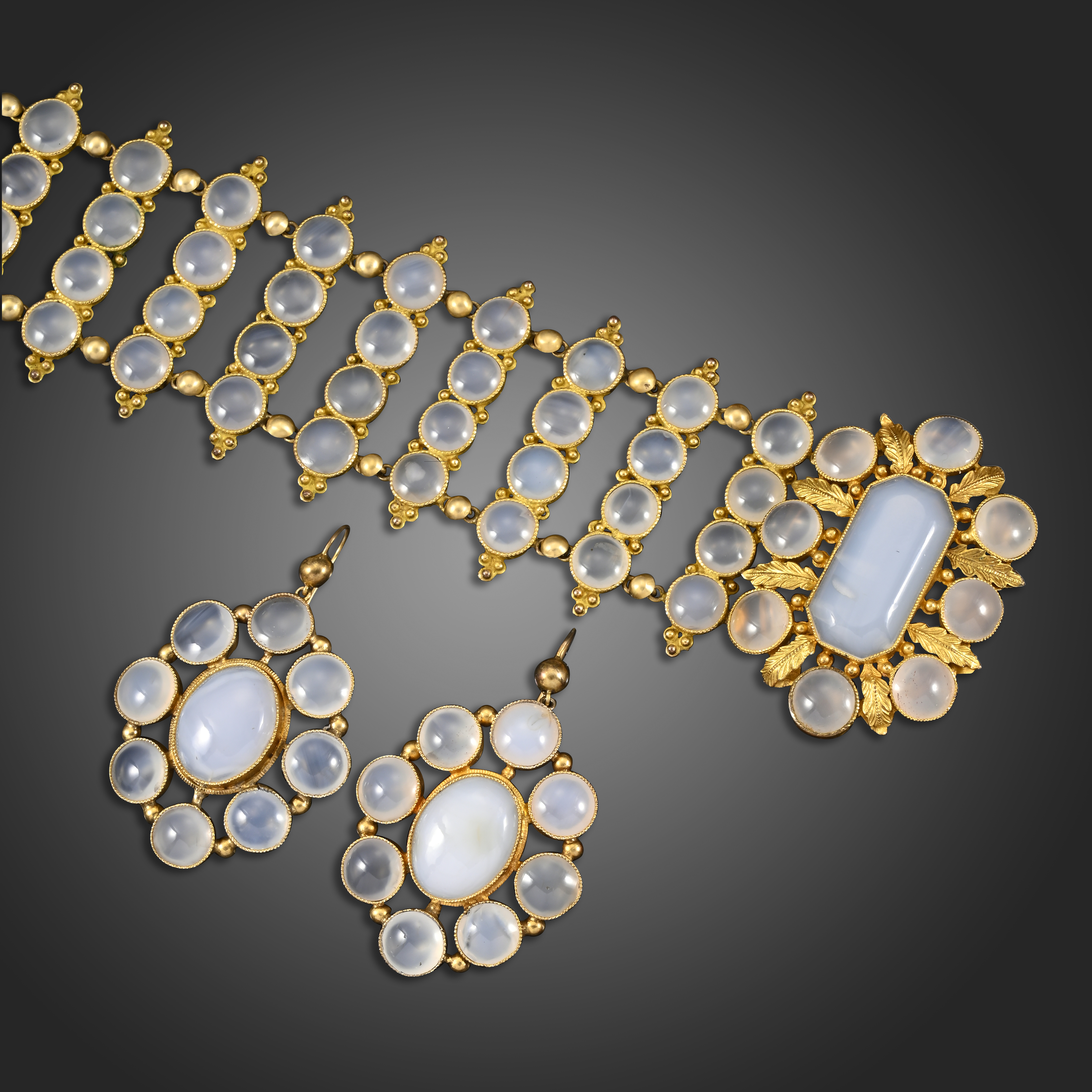 An early 19th century gilt metal bracelet and matching earrings, all set with chalcedony cabochons, bracelet 19cm long