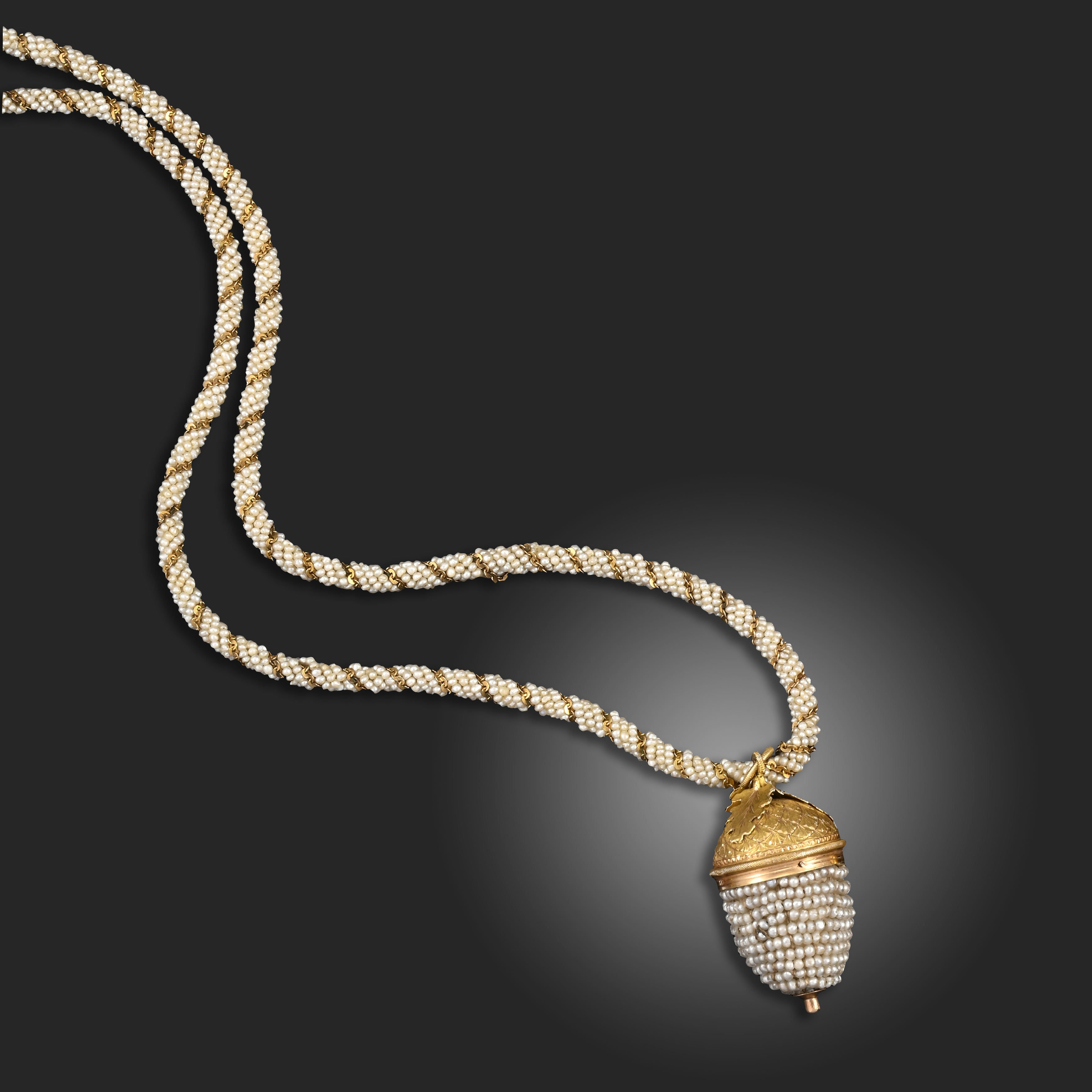 A George III seed pearl and gold acorn necklace, the twisted seed pearl and gold necklace suspends a stylised seed pearl and gold acorn locket pendant, pendant 4cm high, chain 45cm long