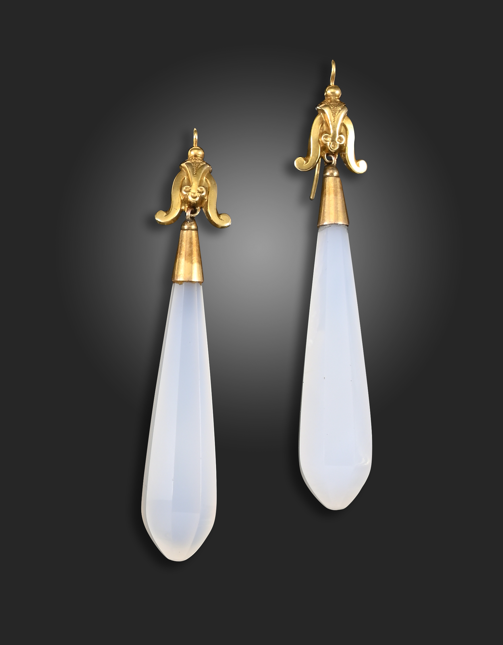 A pair of Victorian gold and chalcedony earrings, the yellow gold scrolls suspend faceted chalcedony drops, 7cm high