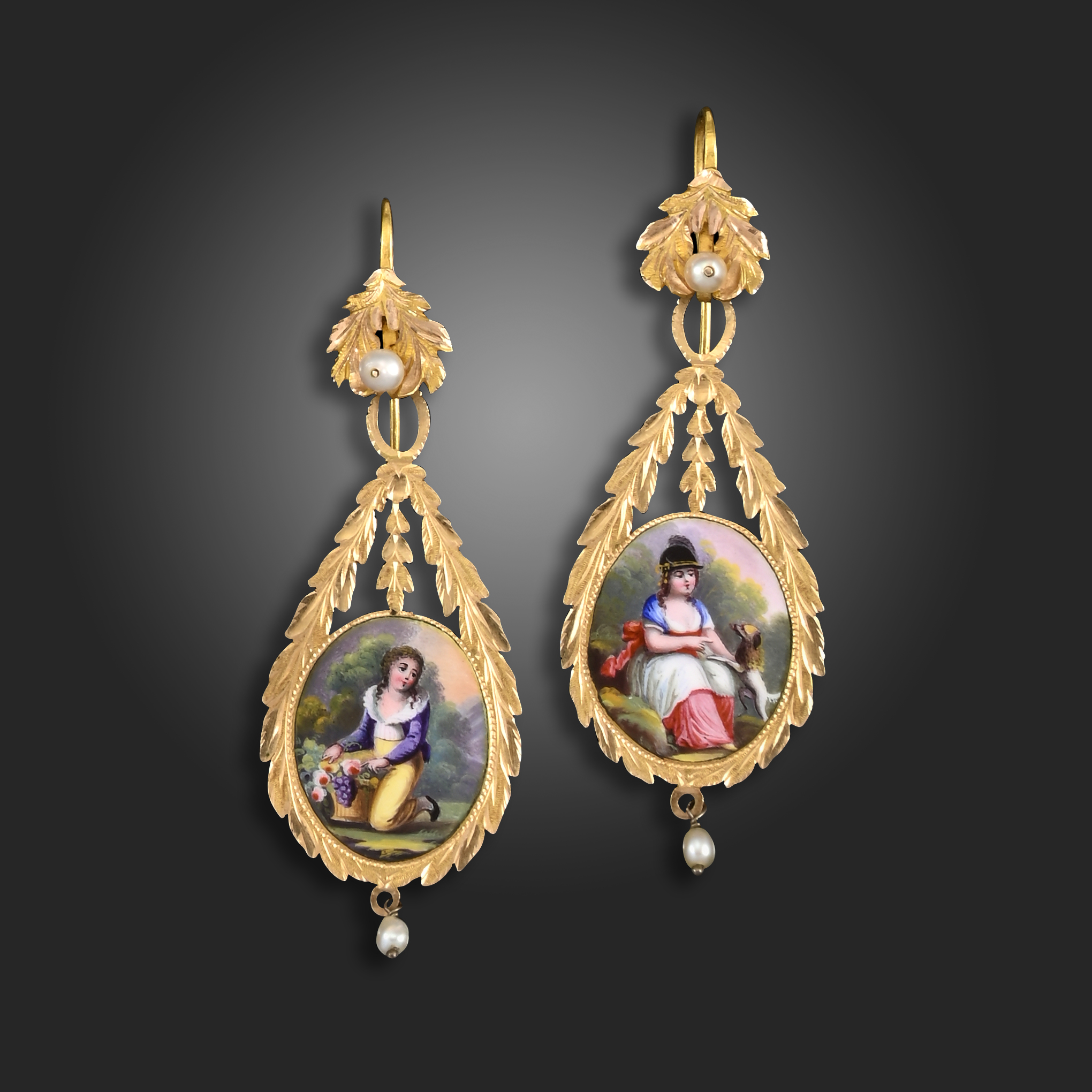 A pair of mid 19th century Swiss enamel and gold earrings, the enamel portrait plaques within gold laurel borders suspending a seed pearl, with blue and white foliate enamel decoration to reverse, hook fittings, 6.2cm high