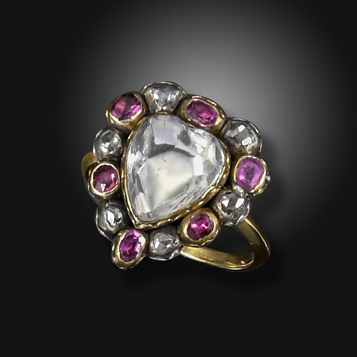 A George III heart-shaped cluster ring, the rock crystal heart is set within a border of rubies and diamonds in closed-back silver and gold mount, size M ½