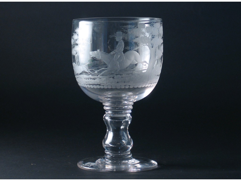 Hunting Interest: a large glass goblet, engraved with huntsmen and hounds in pursuit of a fox, 19th century, 24cm.