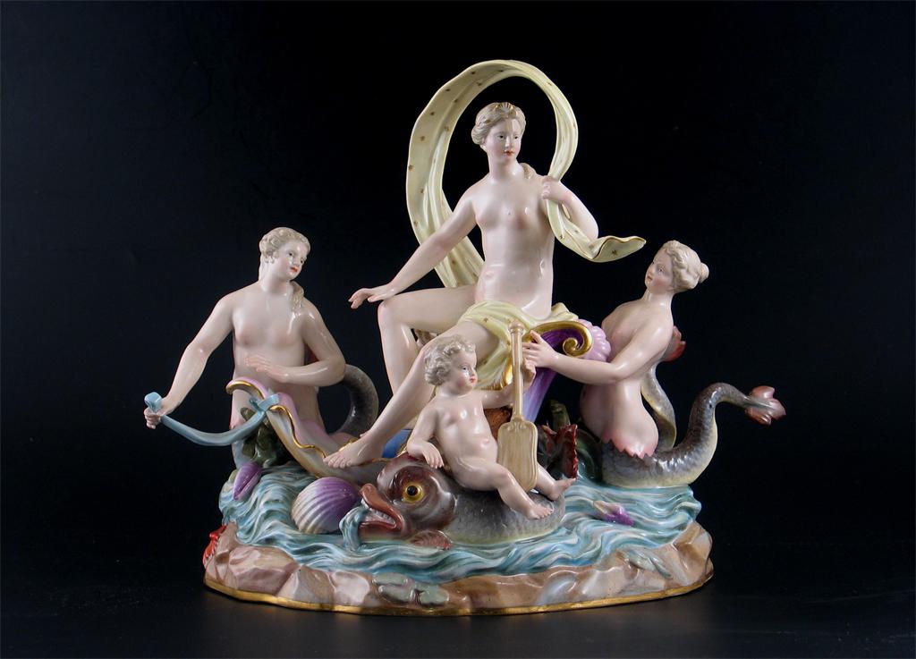 A Meissen mythological group, of Aphrodite riding in a shell-shaped chariot, attended by nerids and a cherub riding a dolphin, crossed swords mark, 19th century, 30cm. Wide.