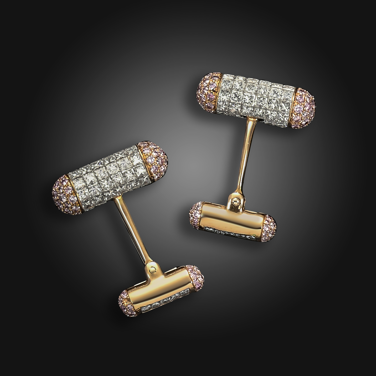 A pair of diamond-set cylindrical bar cufflinks, each link pavé-set with square-shaped diamonds and pink circular diamond terminals, stamped with inventory number 500909 and 750, 2.7cm wide, with fitted case by Oscar Heymen & Brothers