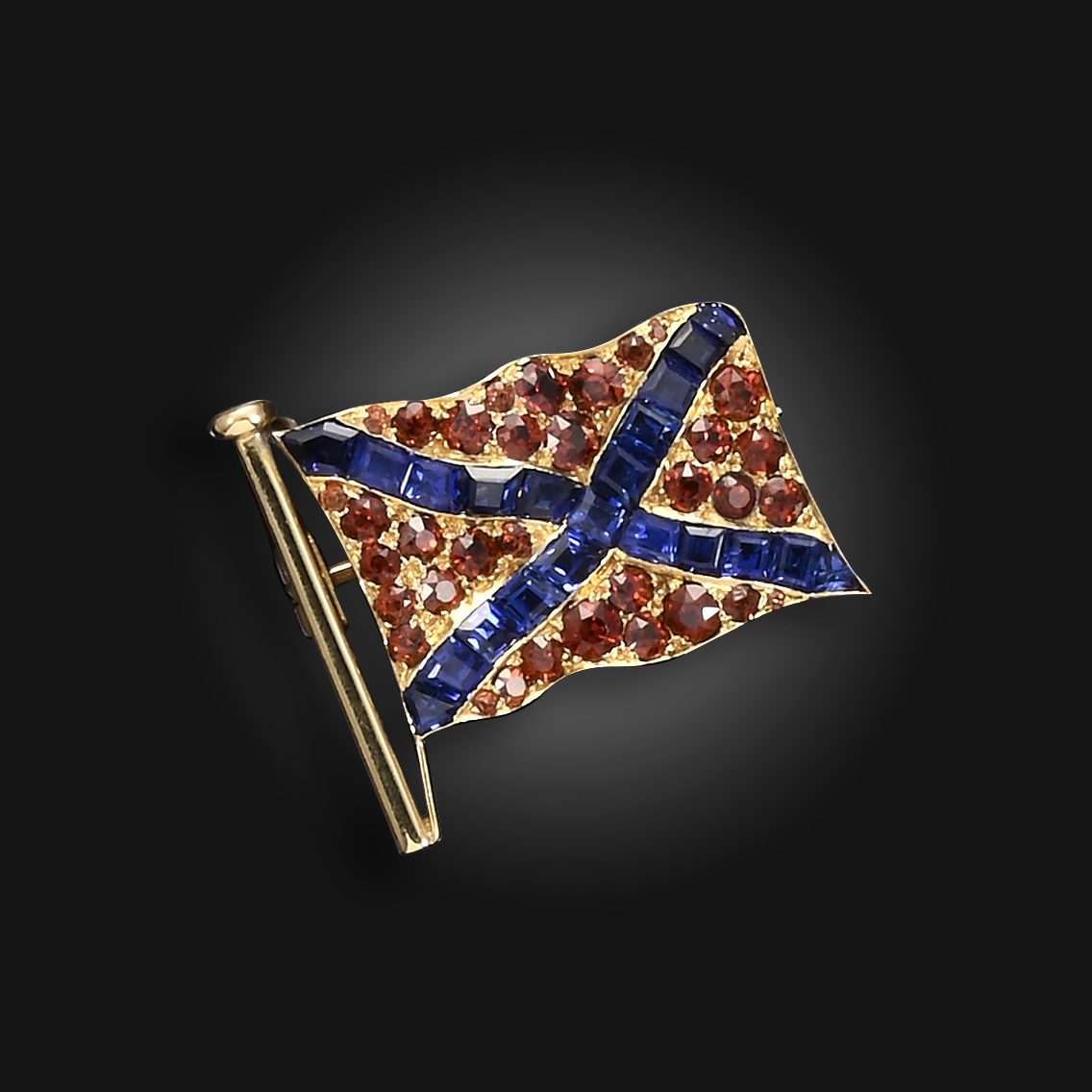 A gem-set gold flag brooch, set with a diagonal cross of blue sapphires and pavé-set to the quarters with deep pink circular cut stones, 2.4cm wide