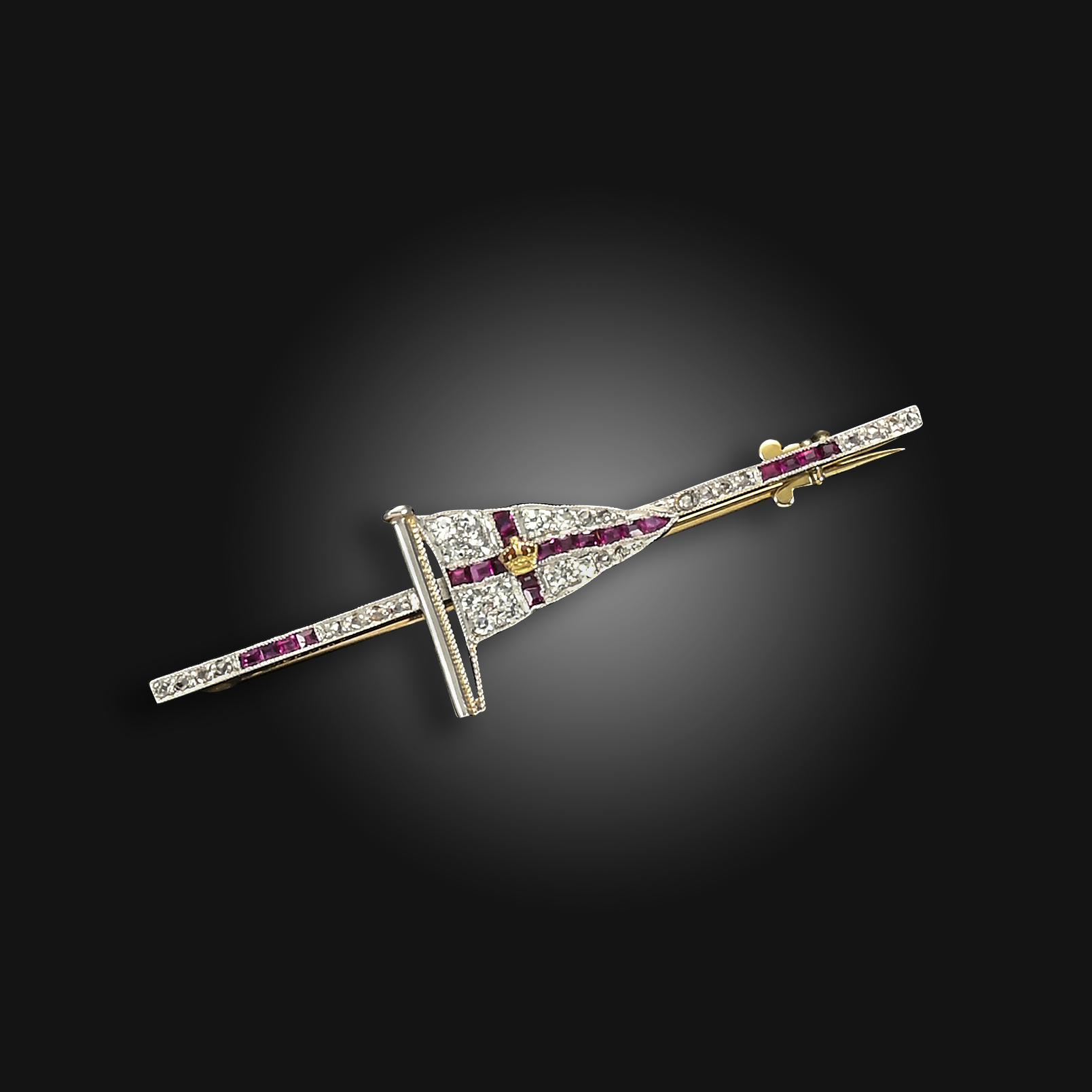 A burgee brooch for the Royal Yacht Squadron, the ruby-set cross centred with a crown and quartered with graduated circular-cut diamonds in gold, the bar brooch alternately millegrain set with smaller diamonds and rubies, 5.5cm wide