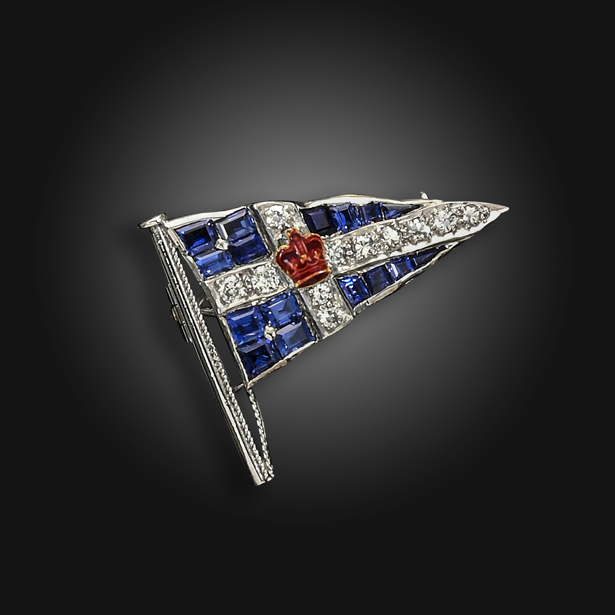 A burgee design brooch for the Royal Thames Yacht Club, with diamond-set cross centred with an enamel decorated crown and quartered with calibre-cut sapphires in 9ct gold, London marks, 3cm wide