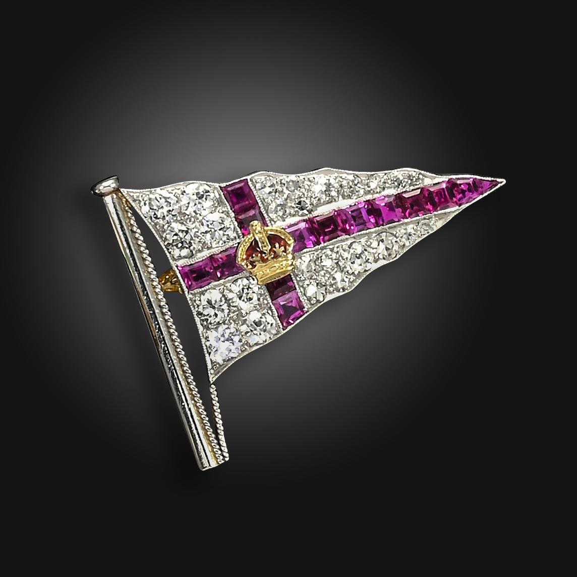 A burgee brooch for the Royal Yacht Squadron, with calibré-cut ruby set cross and centred with a crown, quartered with graduated circular-cut diamonds in platinum and gold, 3.5cm wide