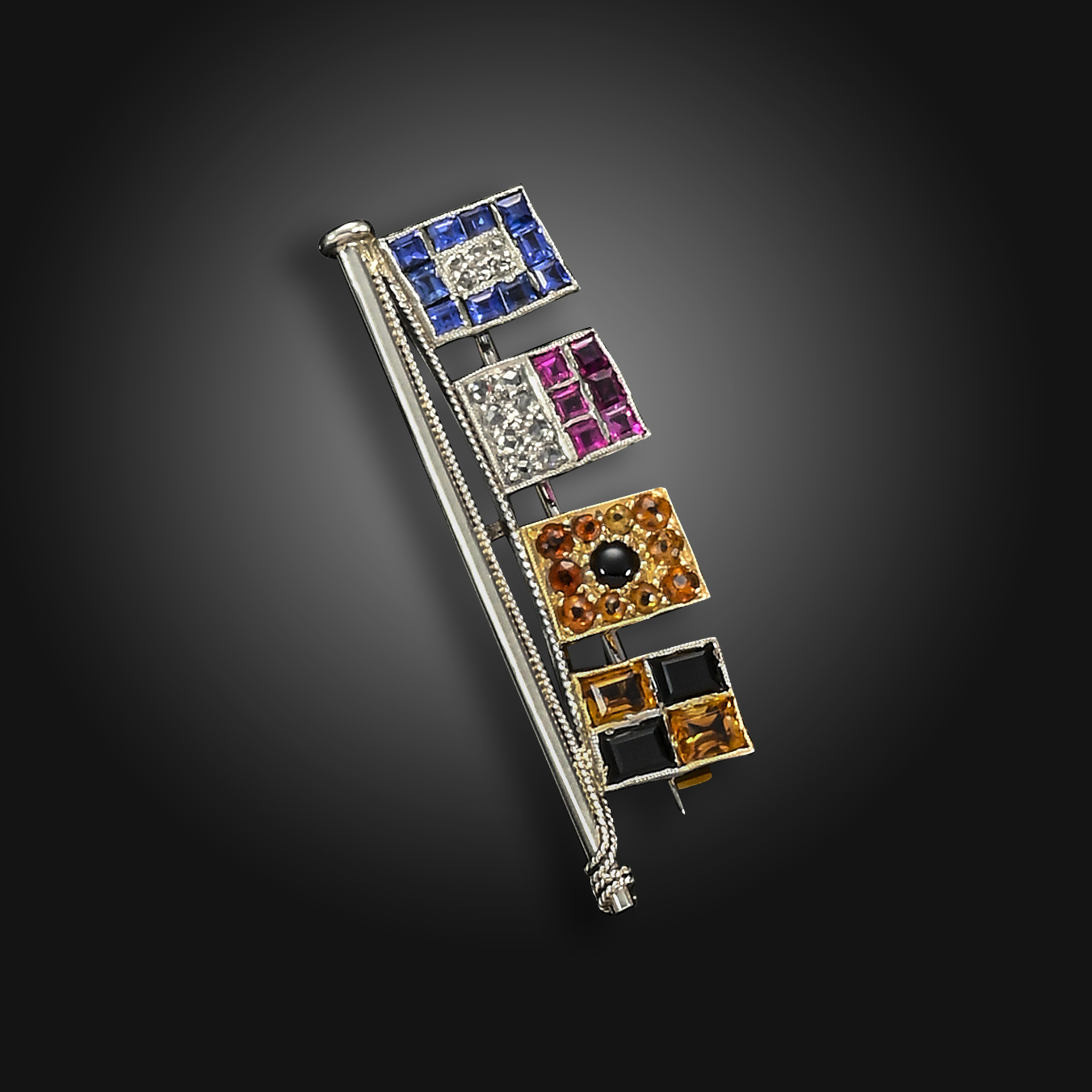 A gem set platinum nautical flag brooch, the four flags spell the words 'PHIL' and are millegrain set with diamonds, sapphires, rubies, citrines and black onyx, 4cm high