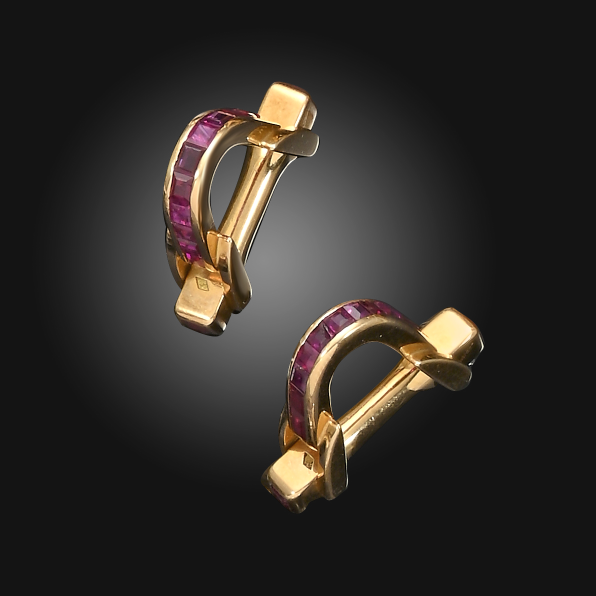 A pair of French ruby-set gold A-form cufflinks, the hoops set with a line of calibré-cut rubies and with further square-shaped rubies to both terminals, French control marks, 2.3cm wide
