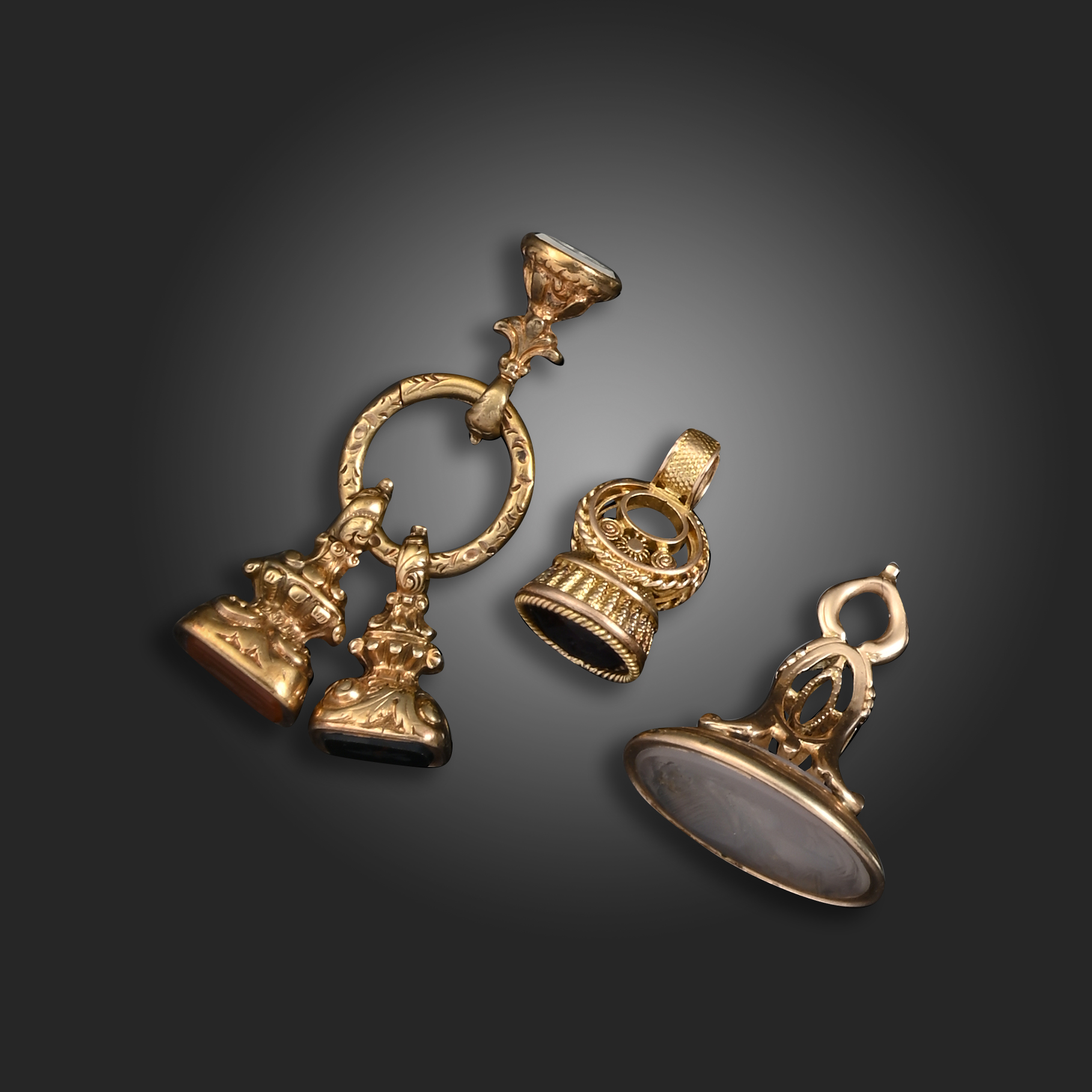 Five early 19th century hardstone and gold-cased fob seals, including a split ring suspending three miniature seals, each set with an intaglio-engraved hardstone plaque, together with a seal containing an oval chalcedony plaque, intaglio-engraved with the profile of a classical maiden, and a seal set with a circular amethyst intaglio-engraved with a floral spray