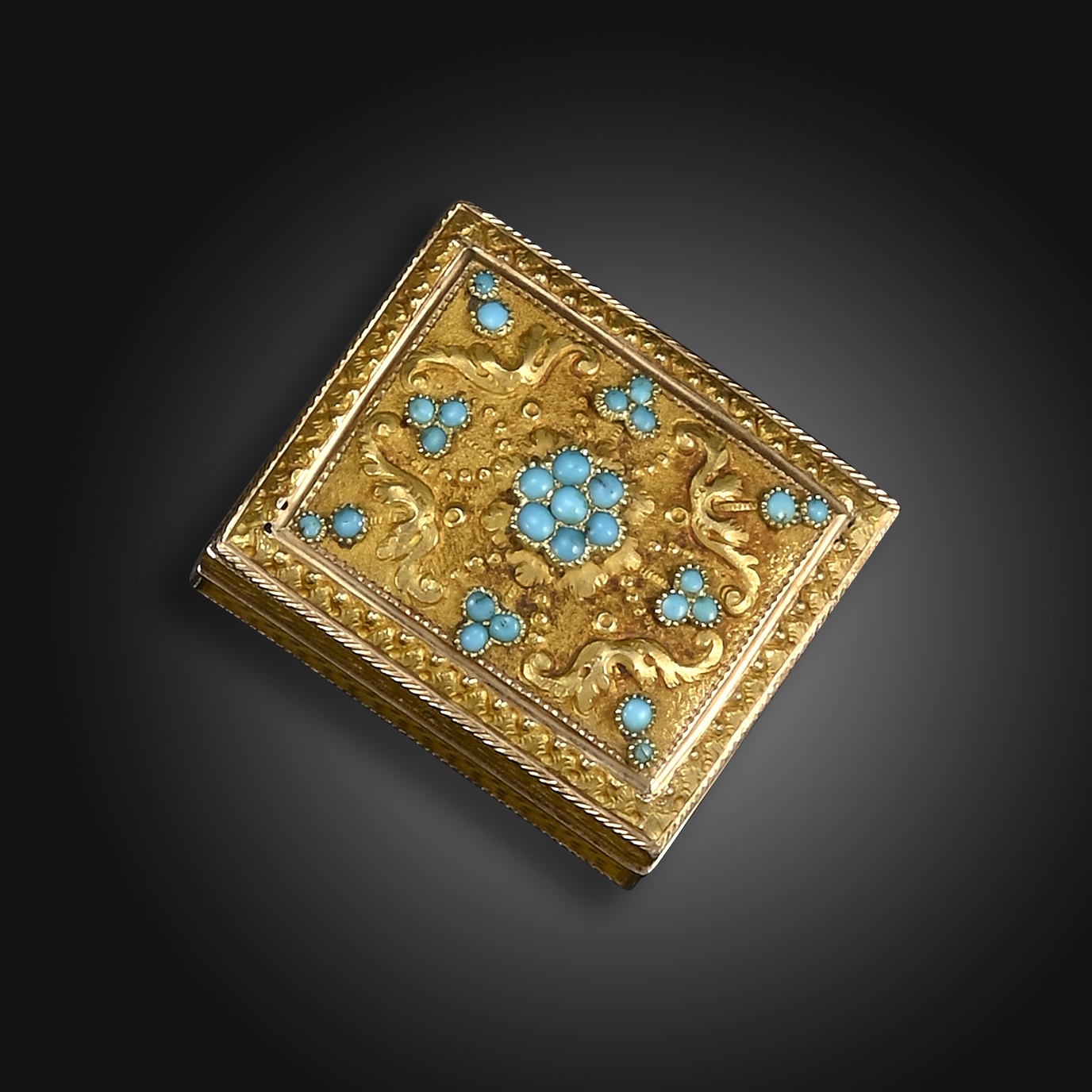 A French early 19th century rectangular gold vinaigrette, the hinged cover decorated with scrolls and pellets on a matted ground, highlighted with turquoise cabochons, engine-turned decoration elsewhere, foliate pierced hinged grille with sponge, French control mark and numbered 156, 3cm wide, 15g