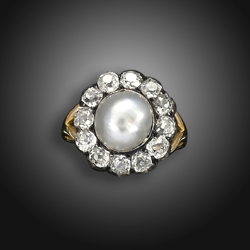A late Victorian natural pearl and diamond cluster ring, the pearl is set within a surround of twelve cushion-shaped diamonds in silver and gold, size O
