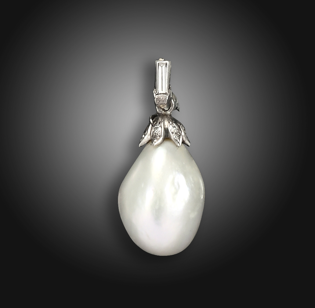 A natural pearl and diamond pendant, the natural pearl suspends from a foliate diamond-set cap, the bale set with a baguette-shaped diamond in platinum and white gold, 3cm high, 3.89g