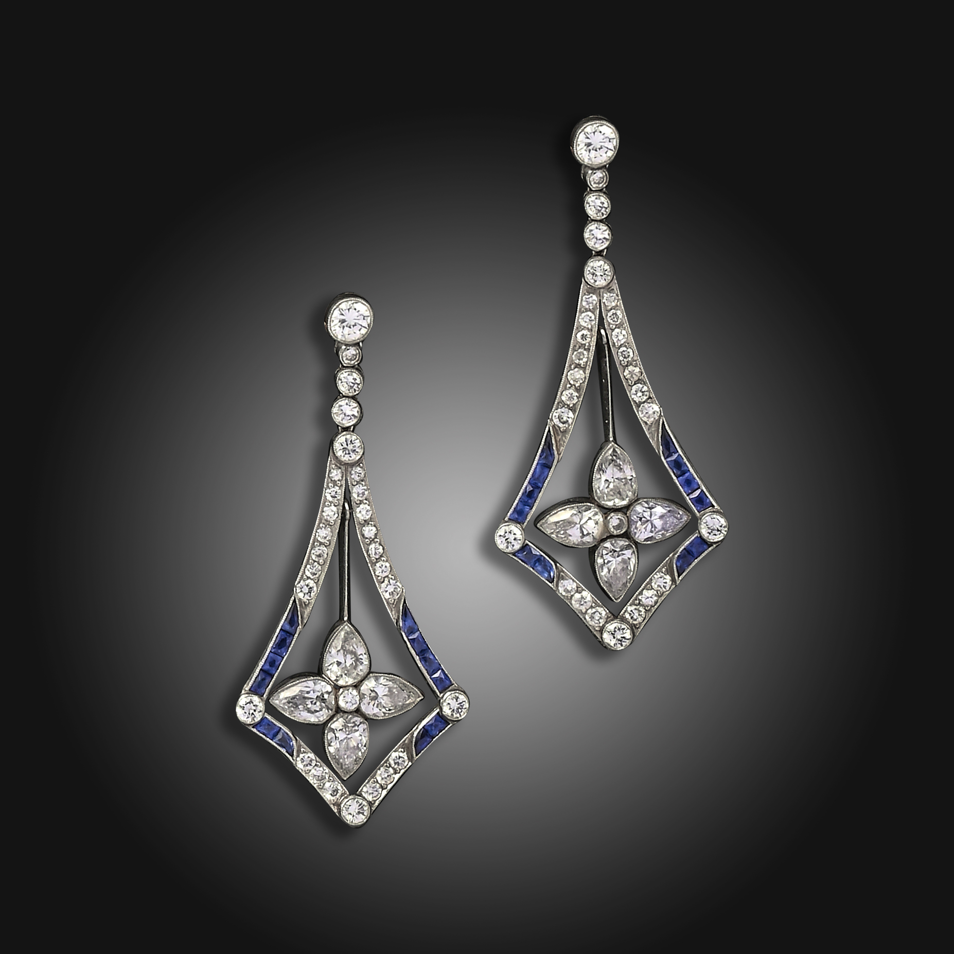 A pair of early 20th century sapphire and diamond drop earrings, each centre quatrefoil formed with four pear-shaped diamonds and centred with a smaller circular-cut diamond, suspending from a frame of small circular-cut diamonds and calibré-cut sapphires, surmounted with a line of five graduated brilliant-cut diamonds in platinum, 5cm high