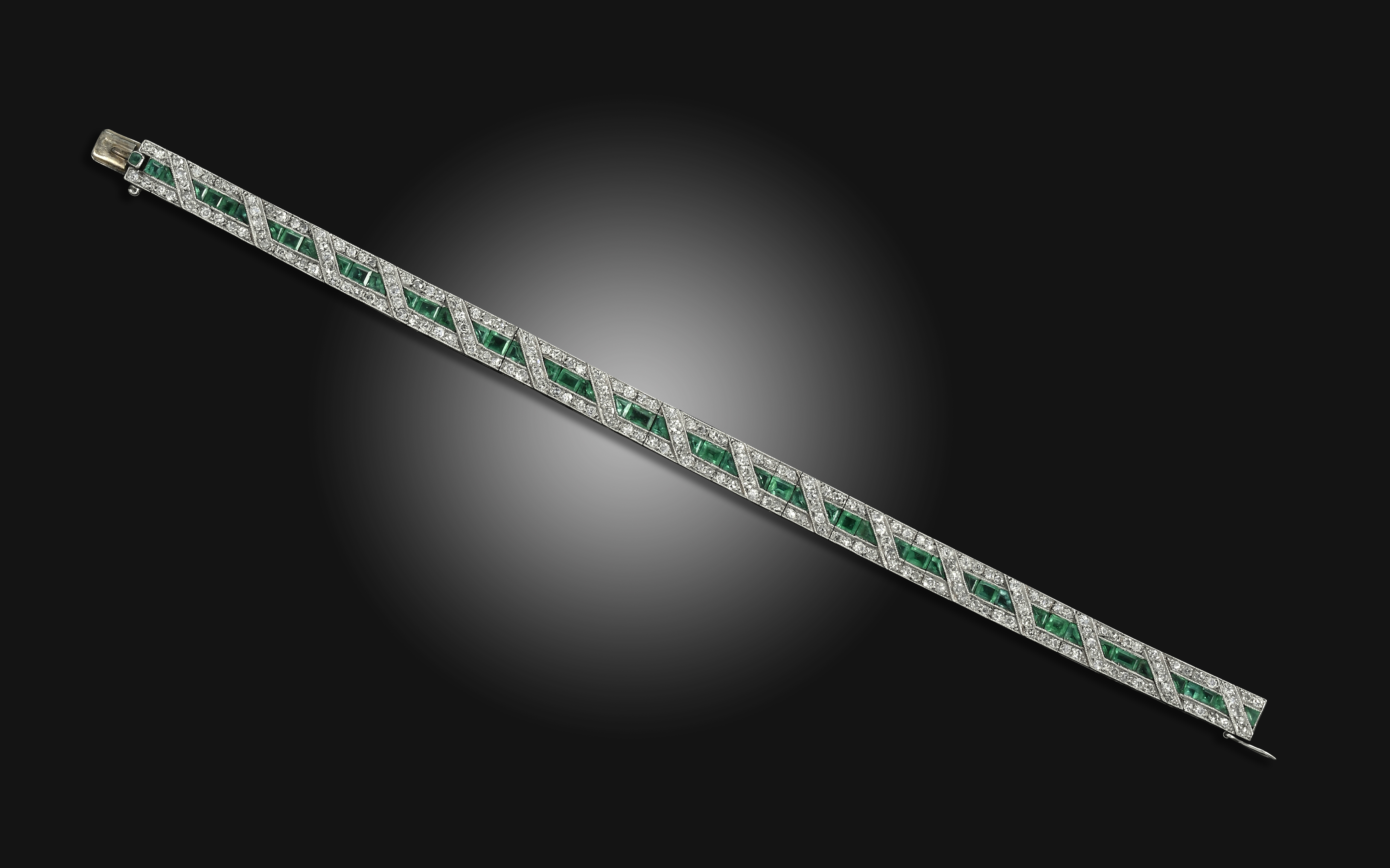 An Art Deco emerald and diamond bracelet, millegrain-set with a central line of rectangular-cut emeralds within borders and overlapping diagonal sections of millegrain-set circular-cut diamonds in platinum, clasp stamped 585, 18.5cm