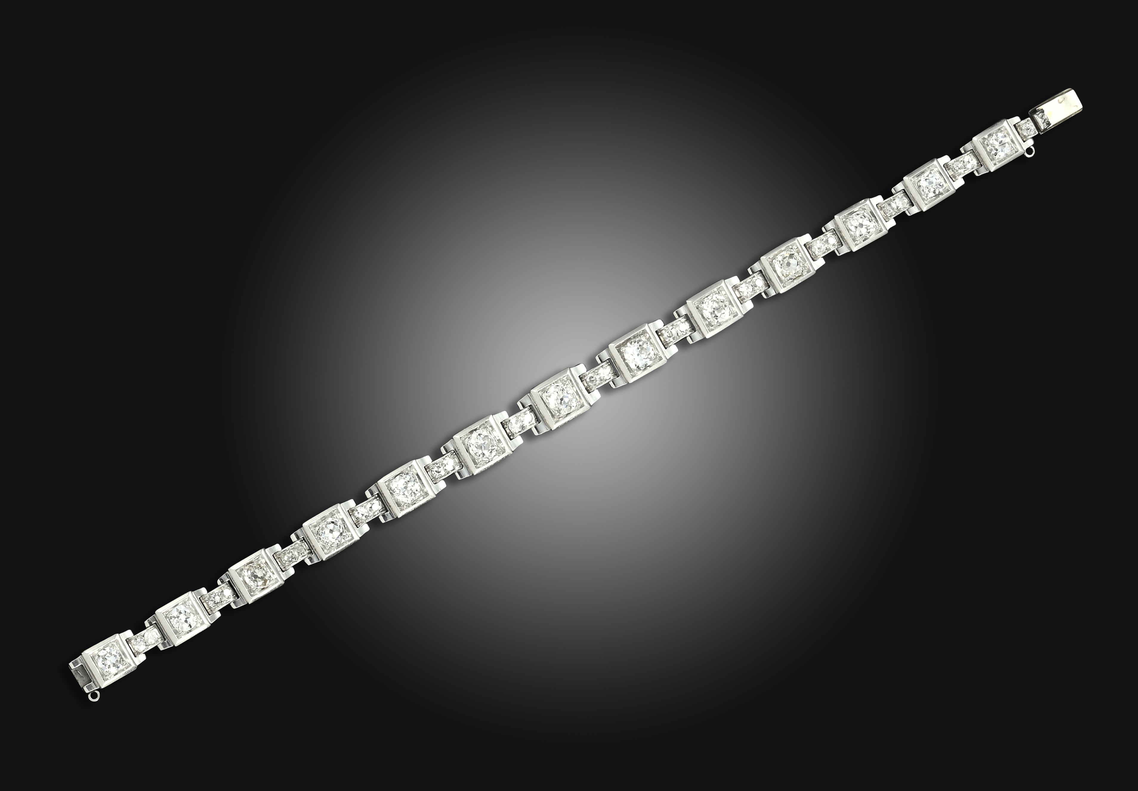 A French diamond-set platinum bracelet, the square-shaped links set with graduated old cushion-shaped diamonds, with diamond-set links, diamonds approximately 4.00cts total, French platinum marks, Swedish import marks, 17cm long
