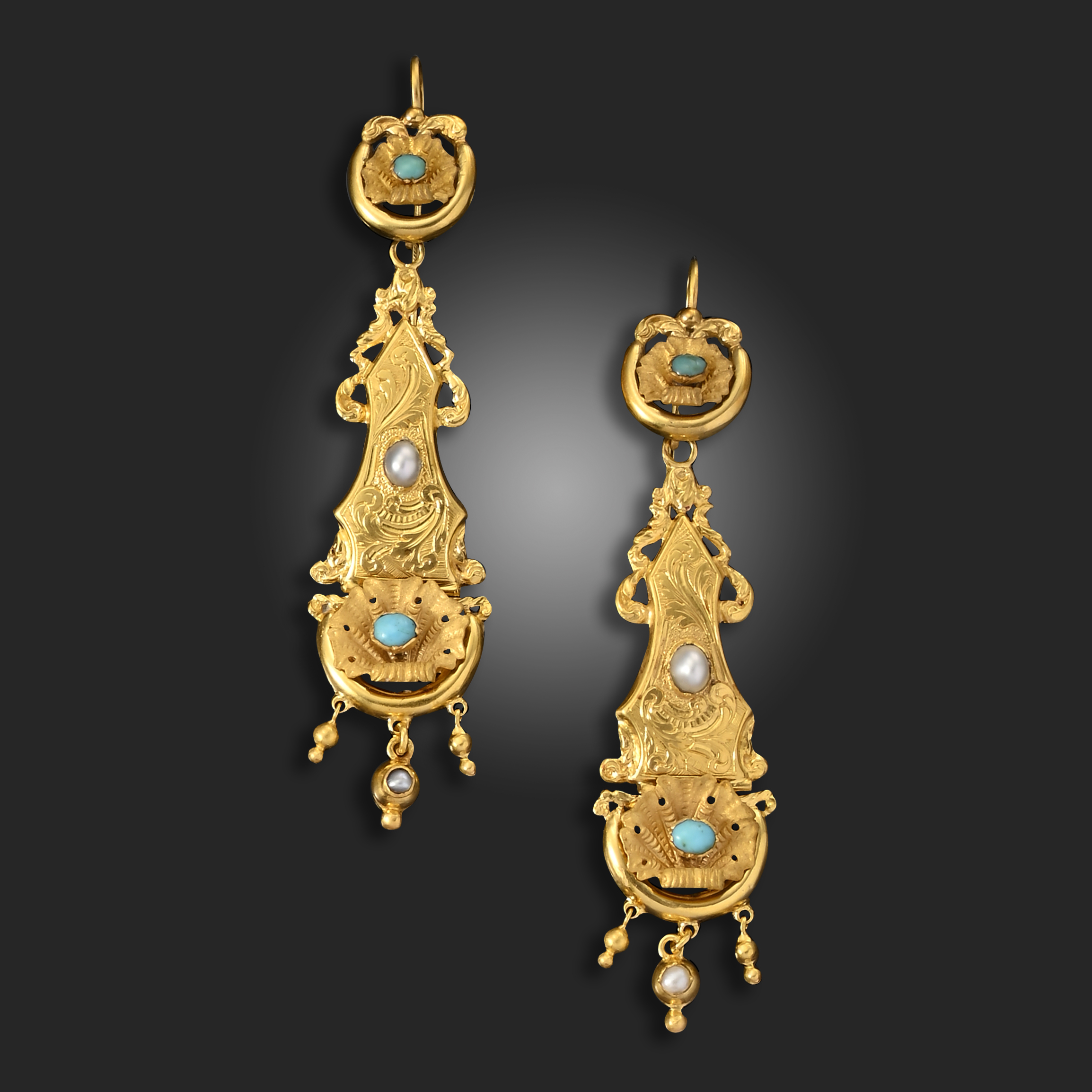 A pair of early 19th century gold drop earrings, decorated with stylised gold shells, turquoise and seed pearls in yellow gold, 7cm high