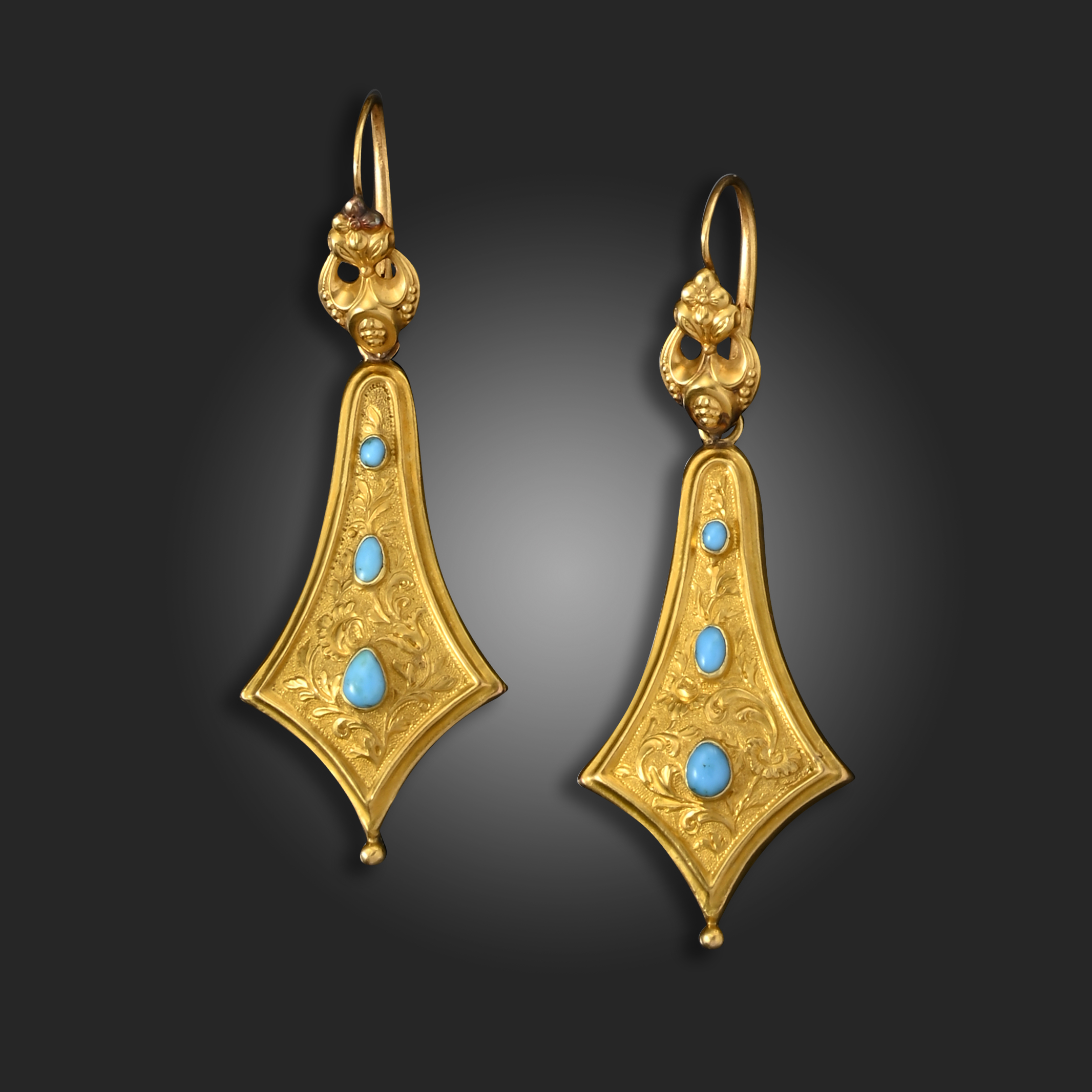 A pair of Victorian gold drop earrings, the hollow gold lozenges with scrolling decoration and set with three graduated turquoise, suspending from a floral gold hoop, 5.8cm high