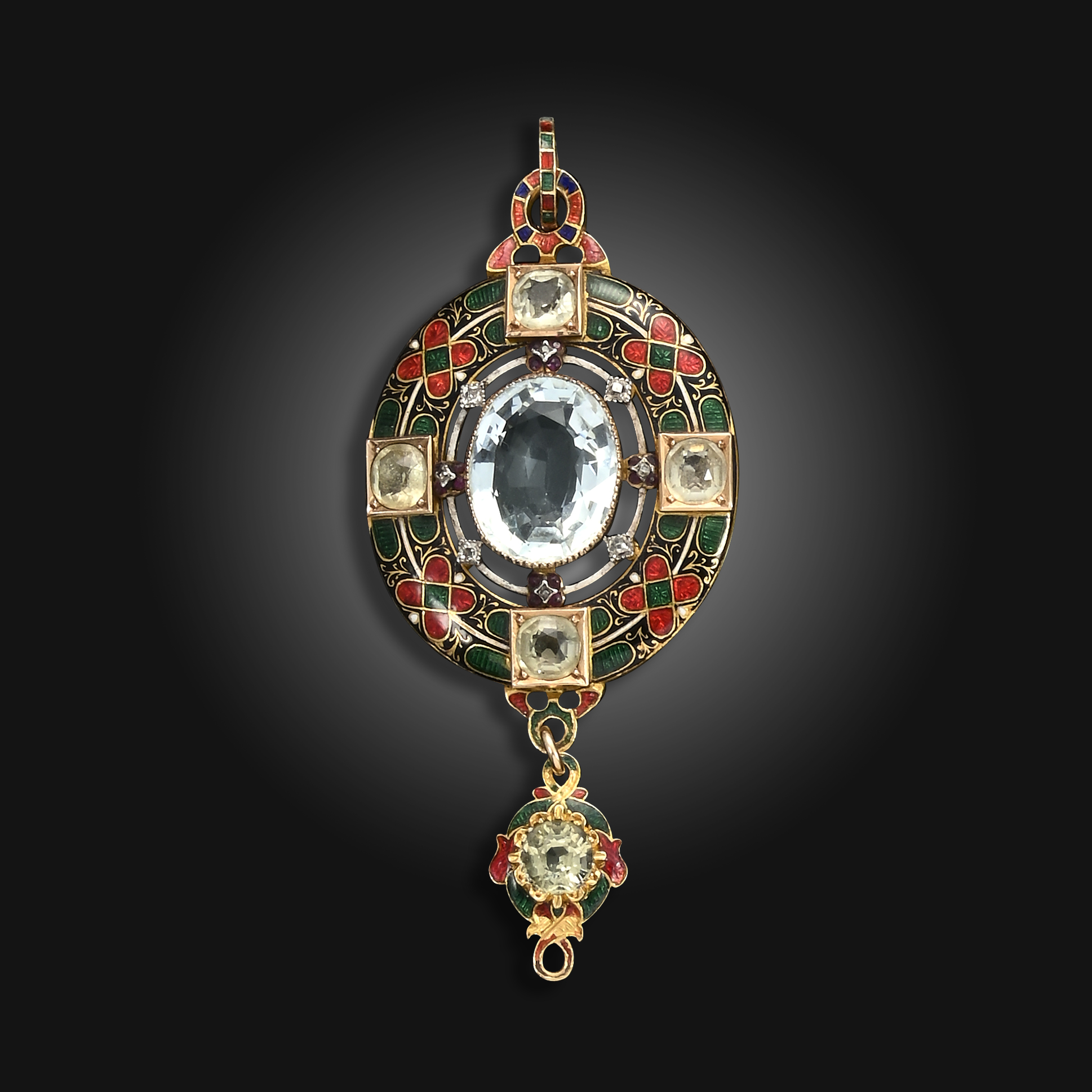 A mid Victorian Holbeinesque enamel and gem-set gold pendant, centred with an oval-shaped aquamarine (possibly a replacement), within an openwork surround set with old circular-cut diamonds and rubies, the surround with polychrome enamel decoration and quartered with cushion-shaped chrysolites, suspending a further chrysolite drop, all set in gold with engraved decoration to the reverse, 7.5cm high