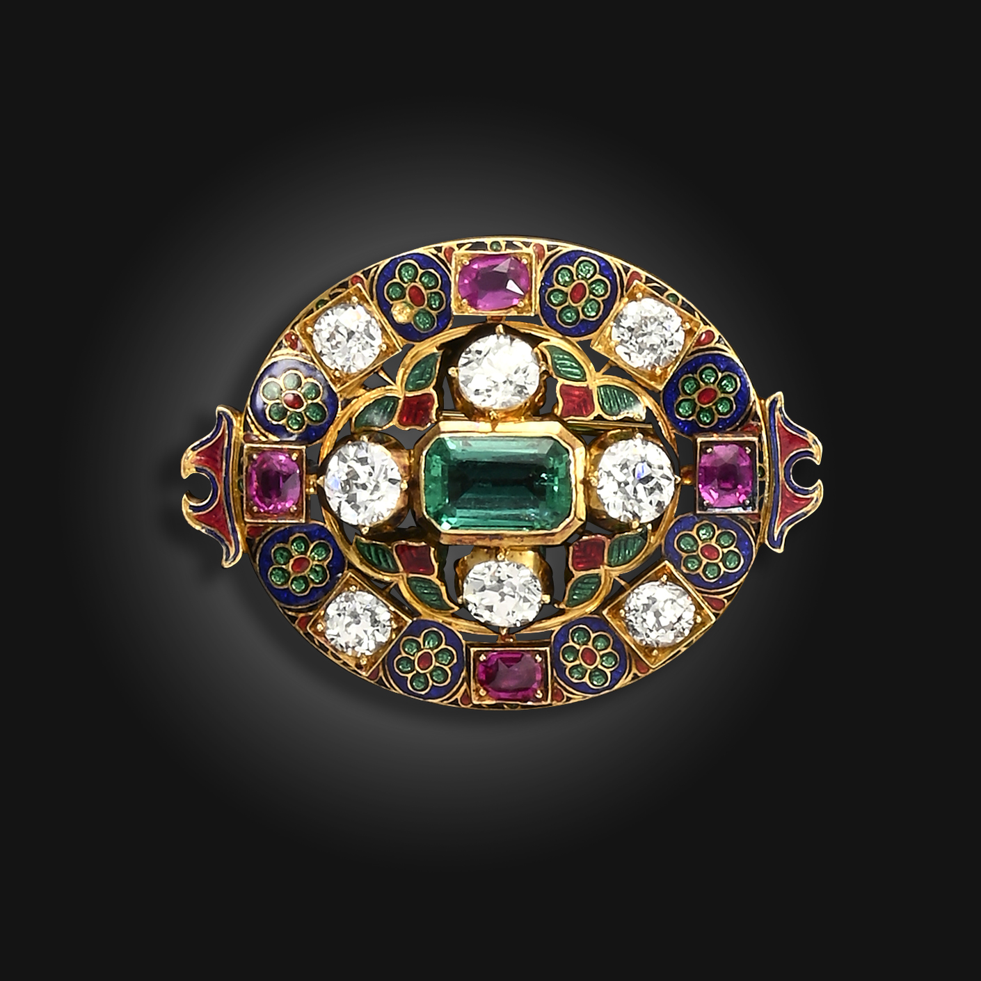 A Victorian gem-set Holbeinesque brooch pendant, decoration overall with polychrome enamel, centred with an emerald-cut emerald, set with four cushion-shaped rubies, eight old circular-cut diamonds in gold, 4.2cm wide