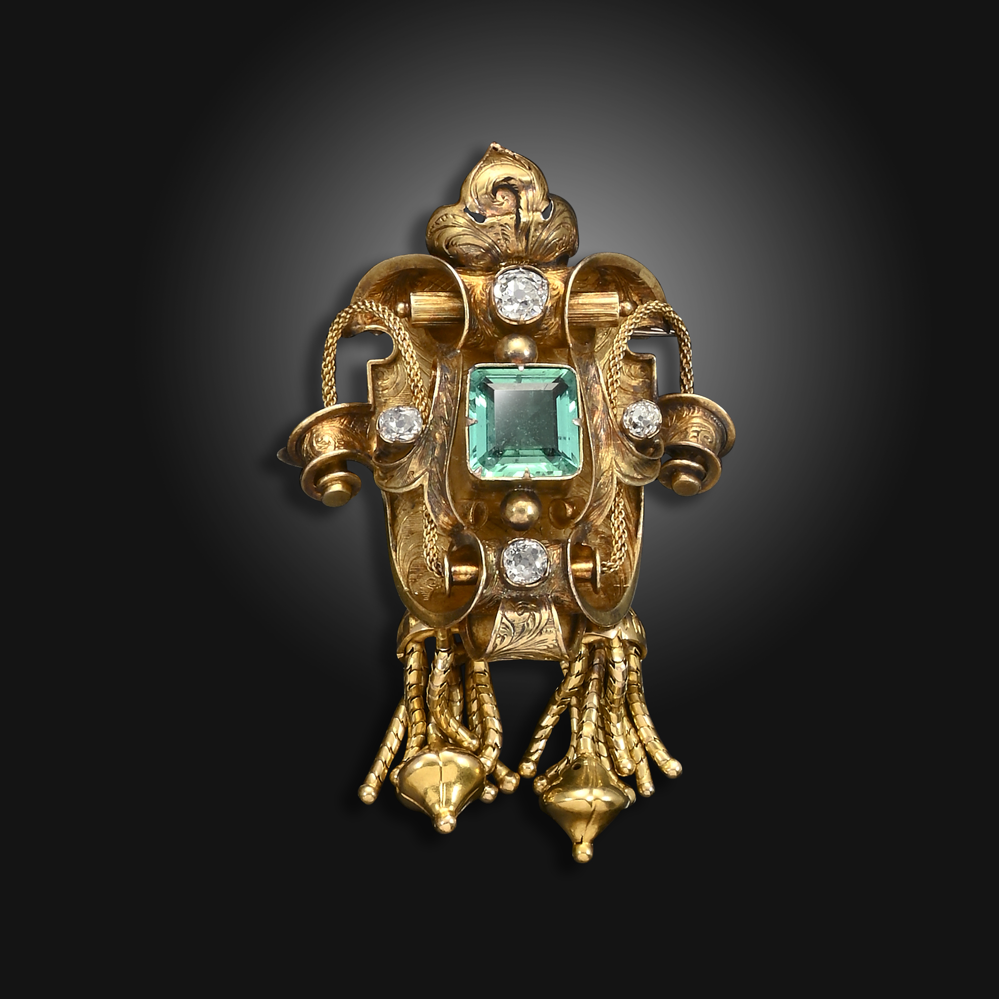 A Victorian emerald and diamond-set gold brooch pendant, the elaborate brooch set with a large square-shaped emerald and four later circular-cut diamonds to the ornate engraved scrolling mount, with two tassels, 6.5cm high