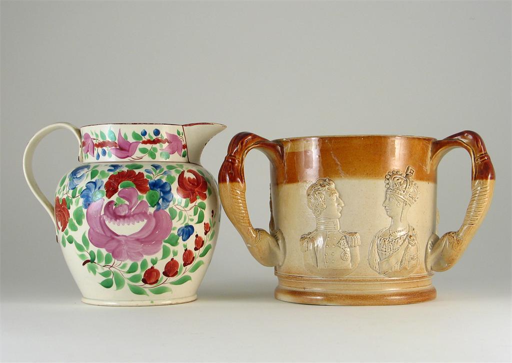 A large brown stoneware Royal Commemorative tyg, decorated with portraits, probably George IV and Queen Caroline, together with a pearlware jug painted with flowers. Both damaged. Both early 19th century, 16cm. (2)