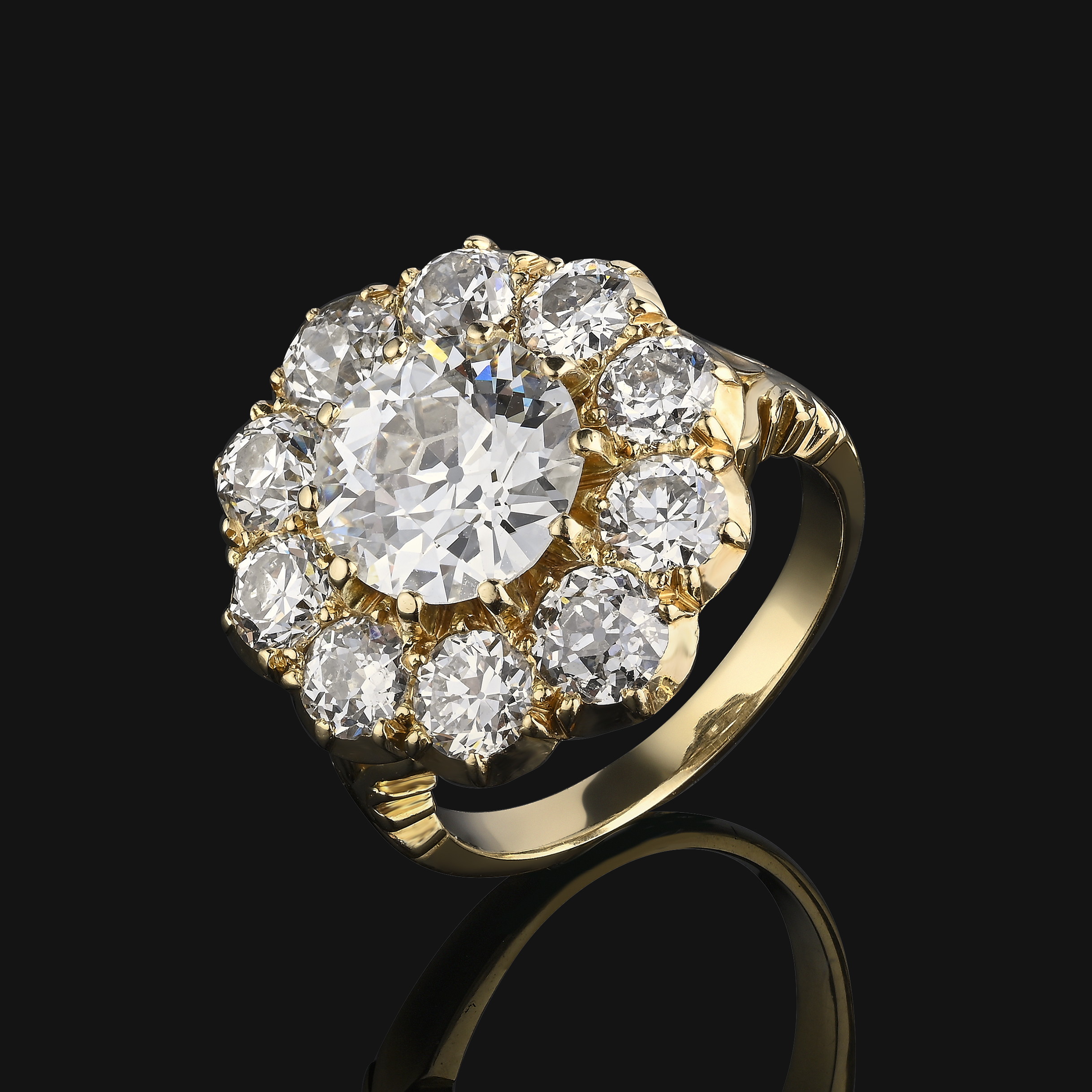 A diamond cluster ring, the transitional round brilliant-cut diamond weighs approximately 2.00cts, within a surround of transitional round brilliant-cut diamonds in gold, with engraved fleur-de-lys shoulders, size K 1/2