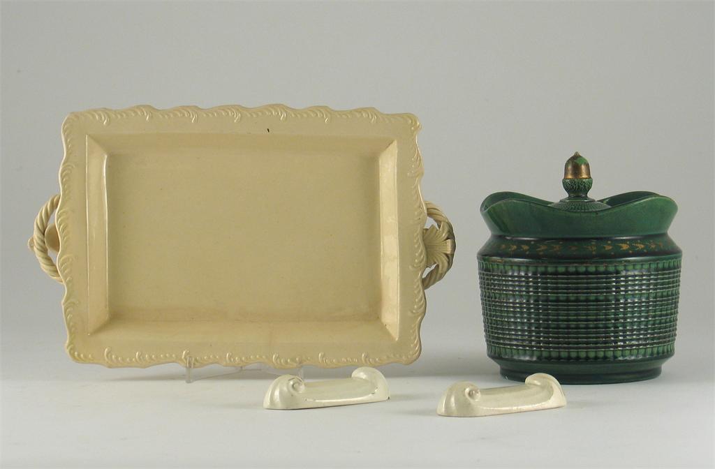 A green glazed engine-turned sugar bowl and cover, decorated with gilt details, a pair of creamware knife rests and a rectangular creamware warmer dish. Some damages. 18th/19th century, 26cm. Max. (5)