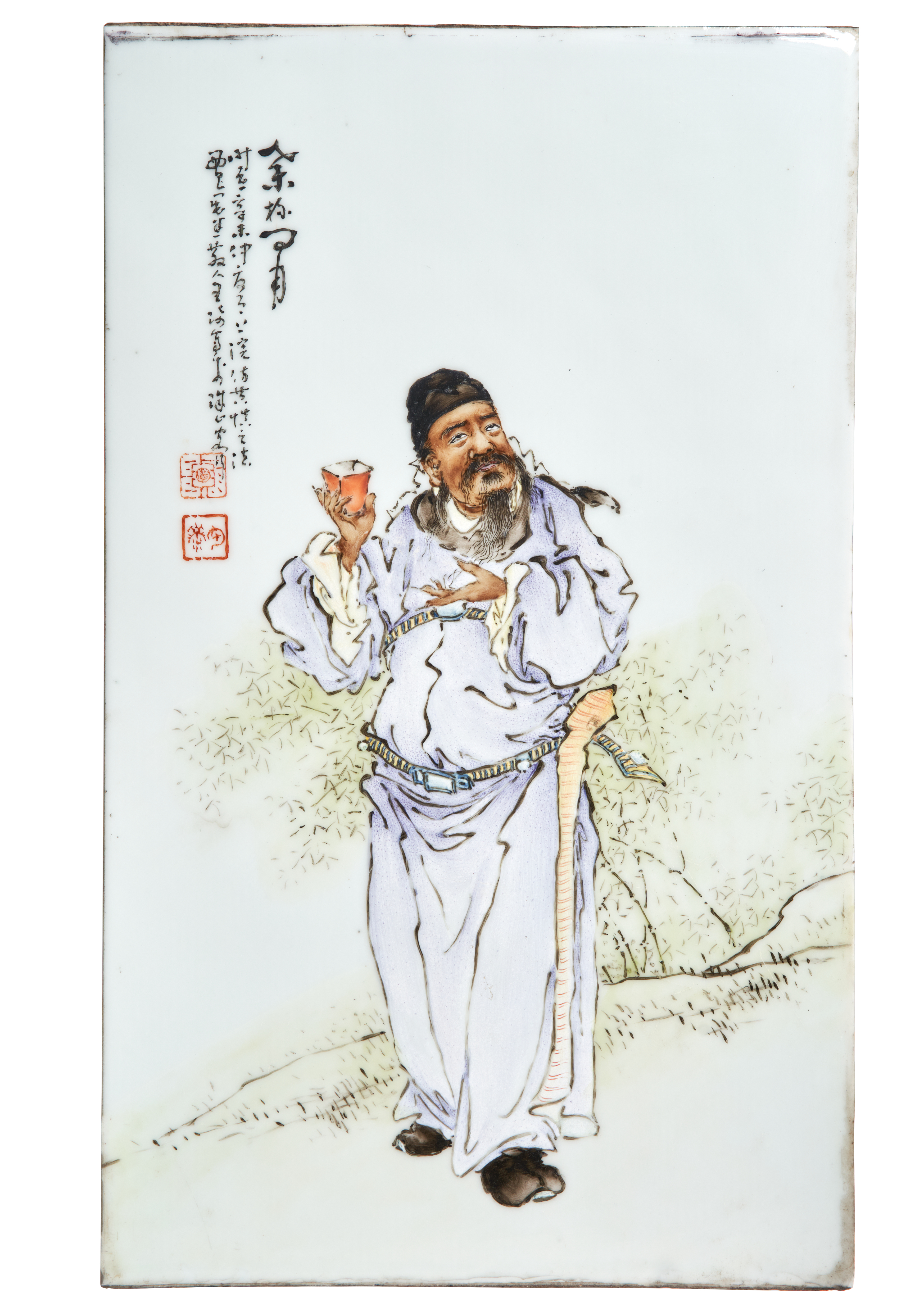 1: This plaque depicts the celebrated Tang dynasty poet Li Bai (701-762) and is entitled ‘Making a toast to the moon’. Li Bai is often portrayed with wine and is sometimes referred to as ‘The Drunken Poet’. The inscription explains that this plaque is painted in the style of Huang Shen (1687-1722), who was a Qing dynasty painter and artistic innovator best known for being one of the Eight Eccentrics of Yangzhou (Yangzhou Ba Gua). It is dated to early summer of the xinwei year (1931).
