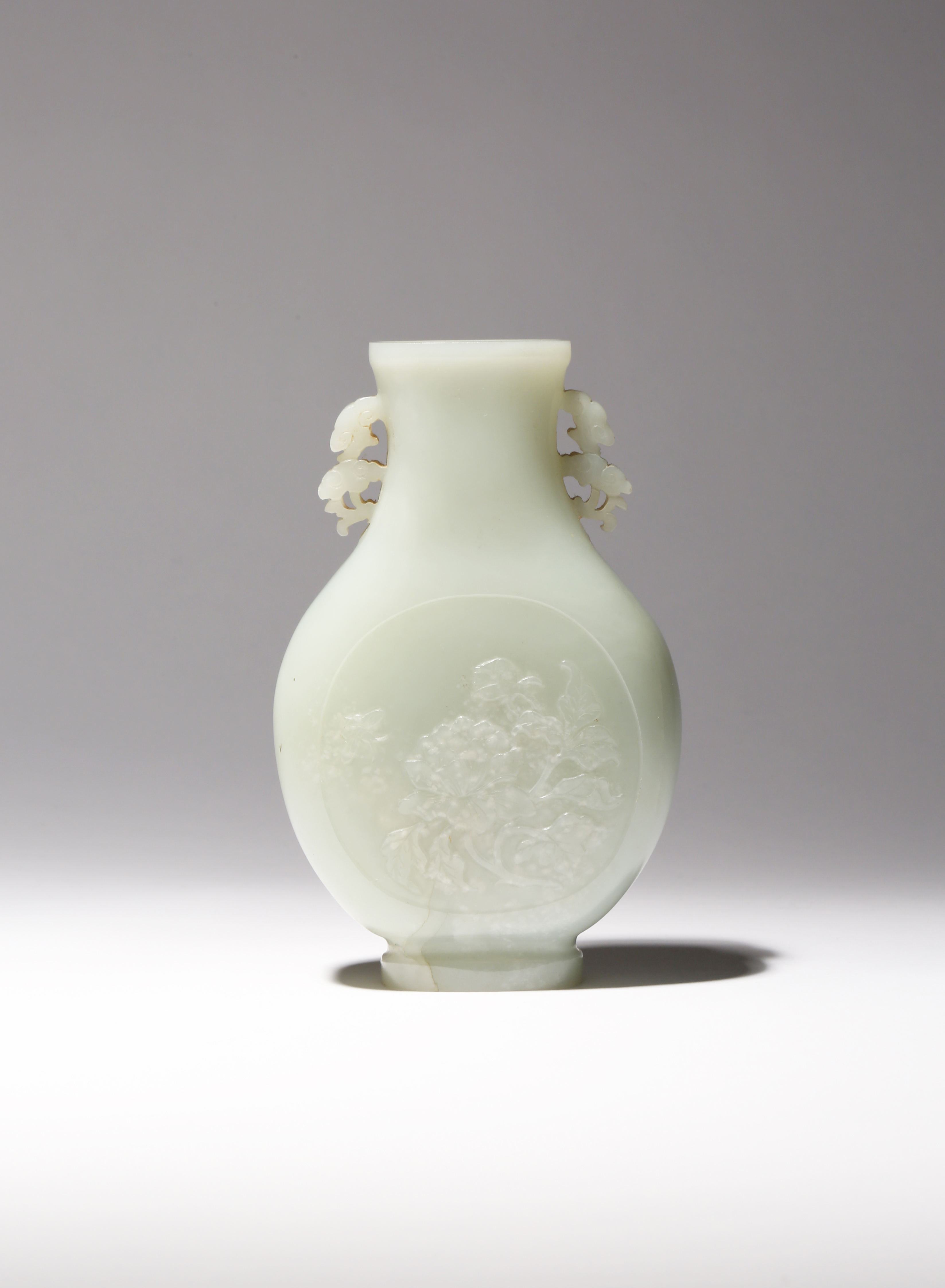 The compressed body raised on a short foot, carved in low relief to each side with roundels enclosing flowering branches of peony and prunus, the neck flanked by sprays of pierced lingzhi, the pale stone with some minor white mottling and russet inclusions, 13.5cm.