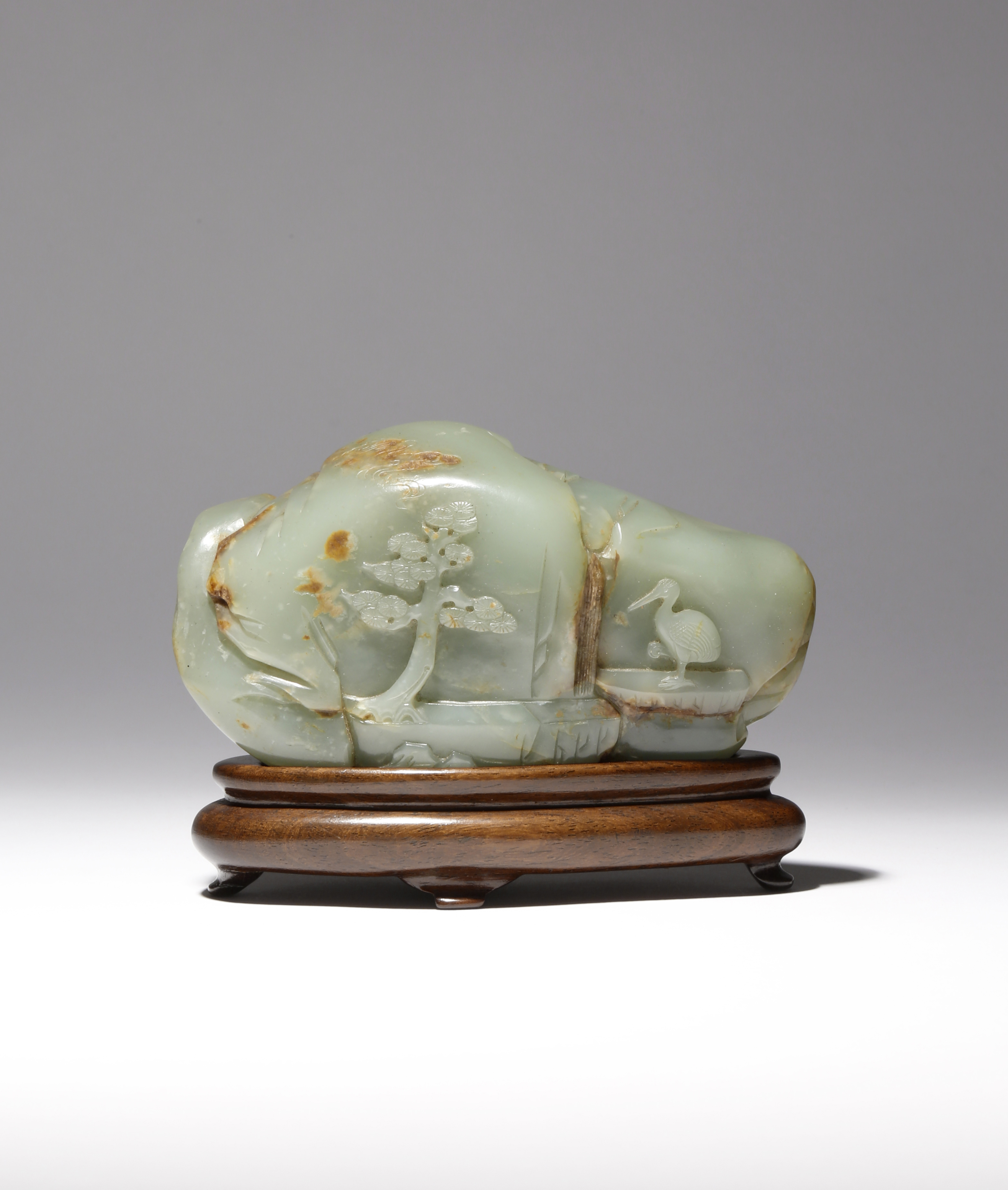 Naturalistically formed as a craggy rock, carved to one side with a pine tree and crane perching on one leg, the reverse with lingzhi, the stone of a greenish tone with russet inclusions, together with a wood stand, 12cm. (2)