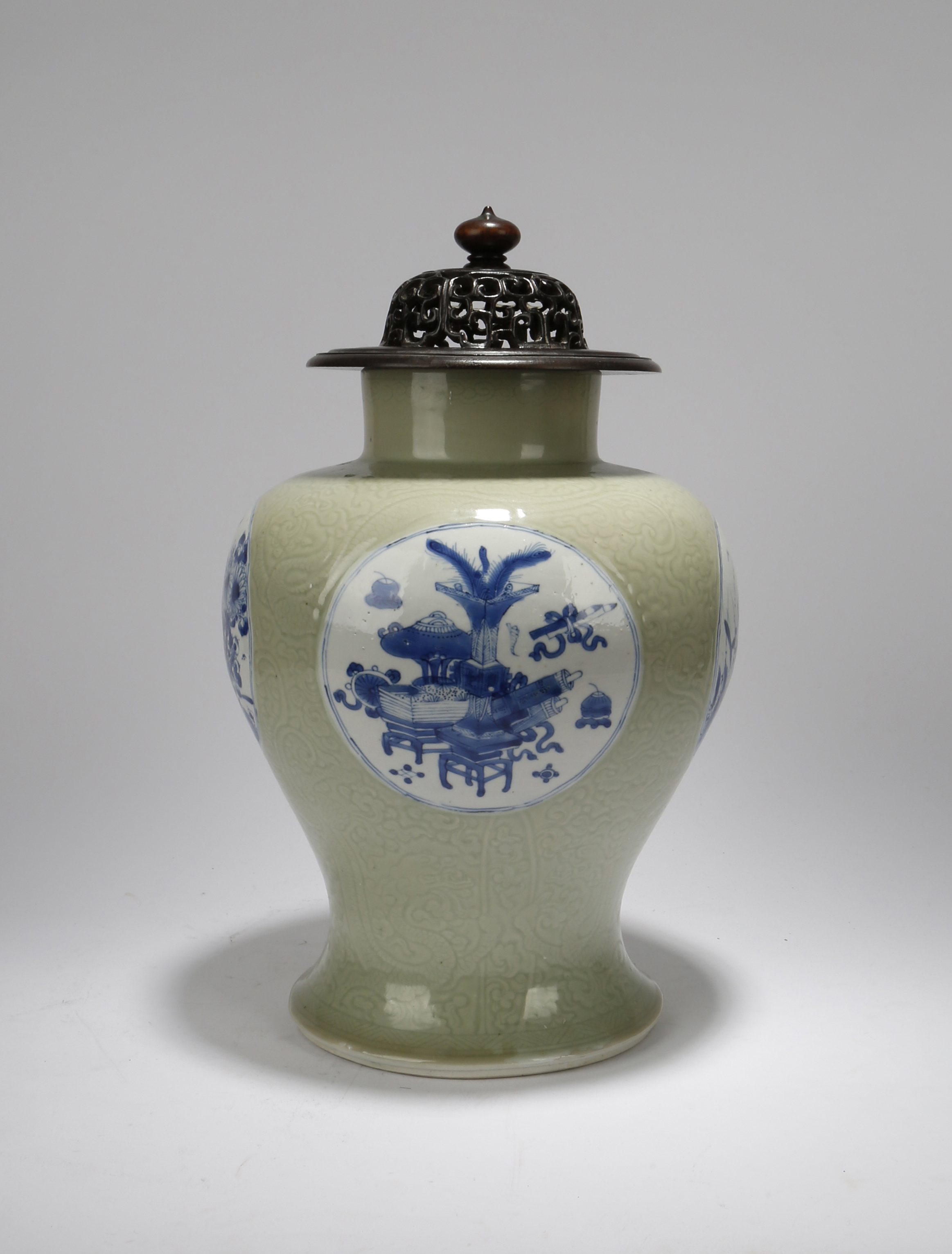 Painted with four large medallions in underglaze blue, two contain precious objects including archaic vessels, furniture and scholars' objects, the others enclose insects in flight amidst blossoming flowers and rockwork, the panels reserved on a pale green ground engraved with dragons amongst peony flowerheads, together with a pierced wood cover, 33cm. (2)