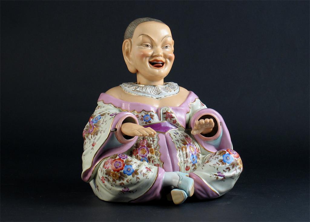 A Continental porcelain pagoda figure, after Meissen, with a nodding head and rocking hands, sitting cross-legged and wearing a floral robe, impressed and printed marks, c.1900, 23.5cm.