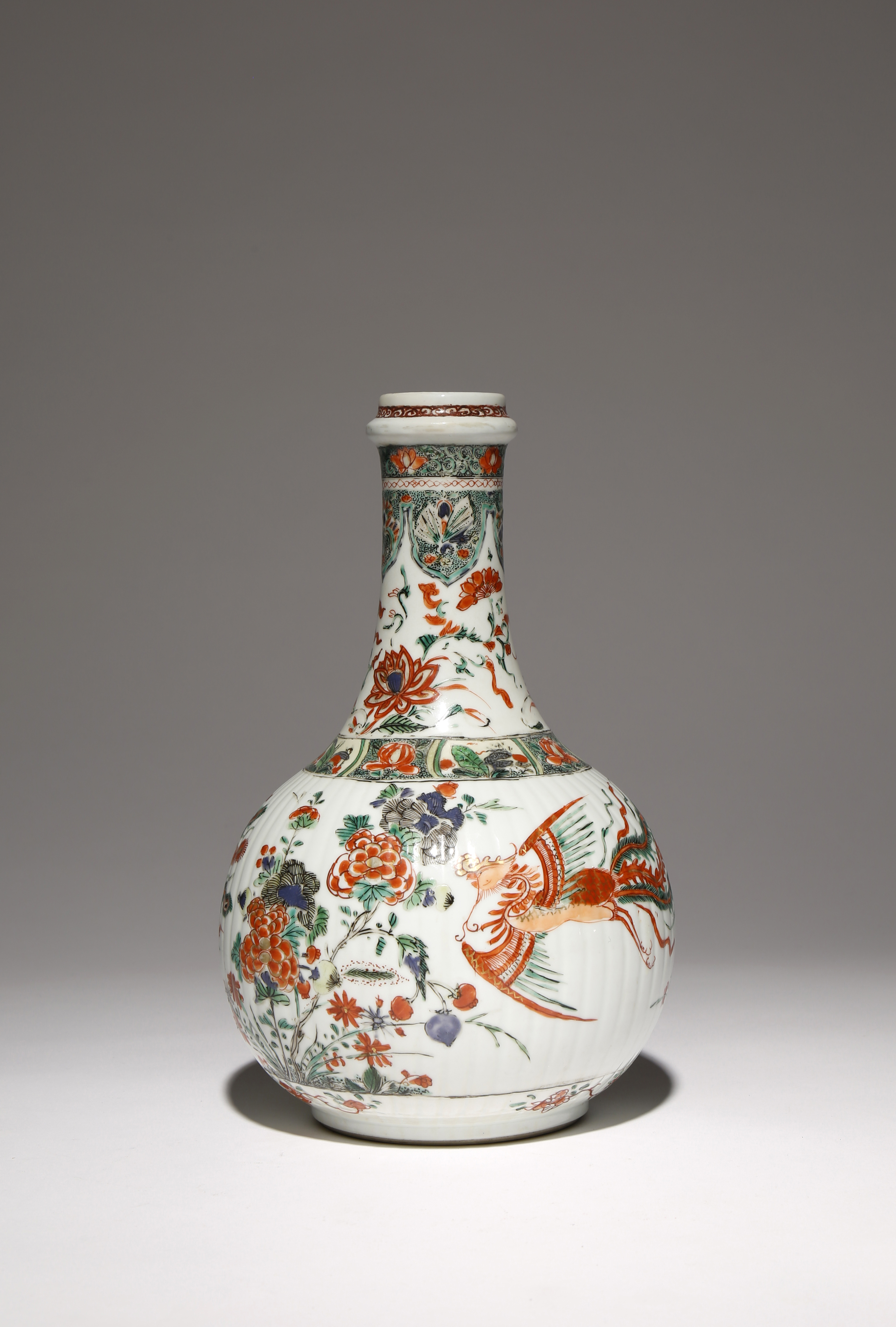 The ribbed globular body painted with two phoenix in flight amidst blossoming peony branches, the slender neck decorated with lotus sprays and lappets enclosing butterflies on a green ground, with areas of detail picked out in gilt, 25.2cm.
