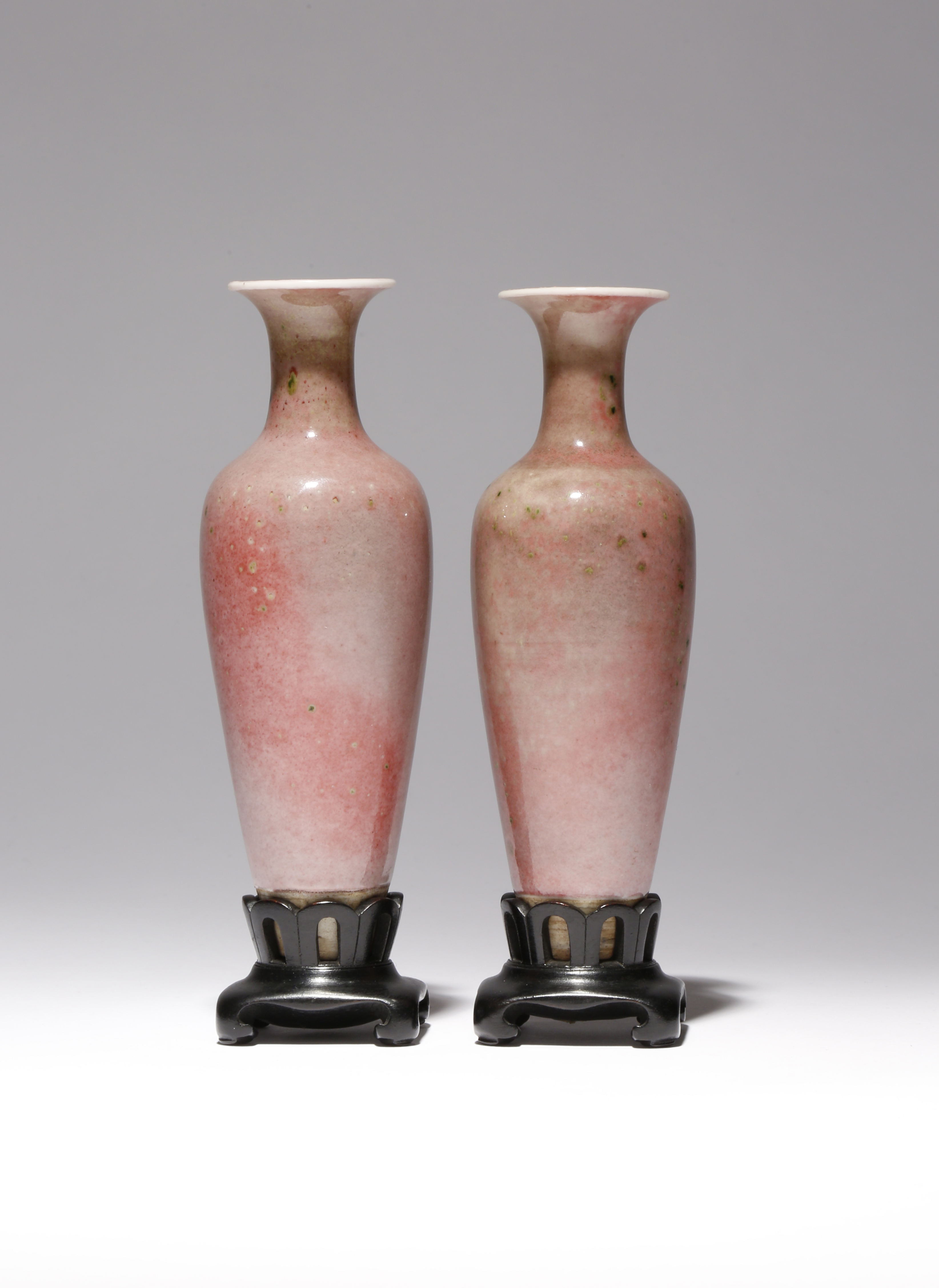 A PAIR OF CHINESE PEACHBLOOM GLAZED TAPERING VASES
