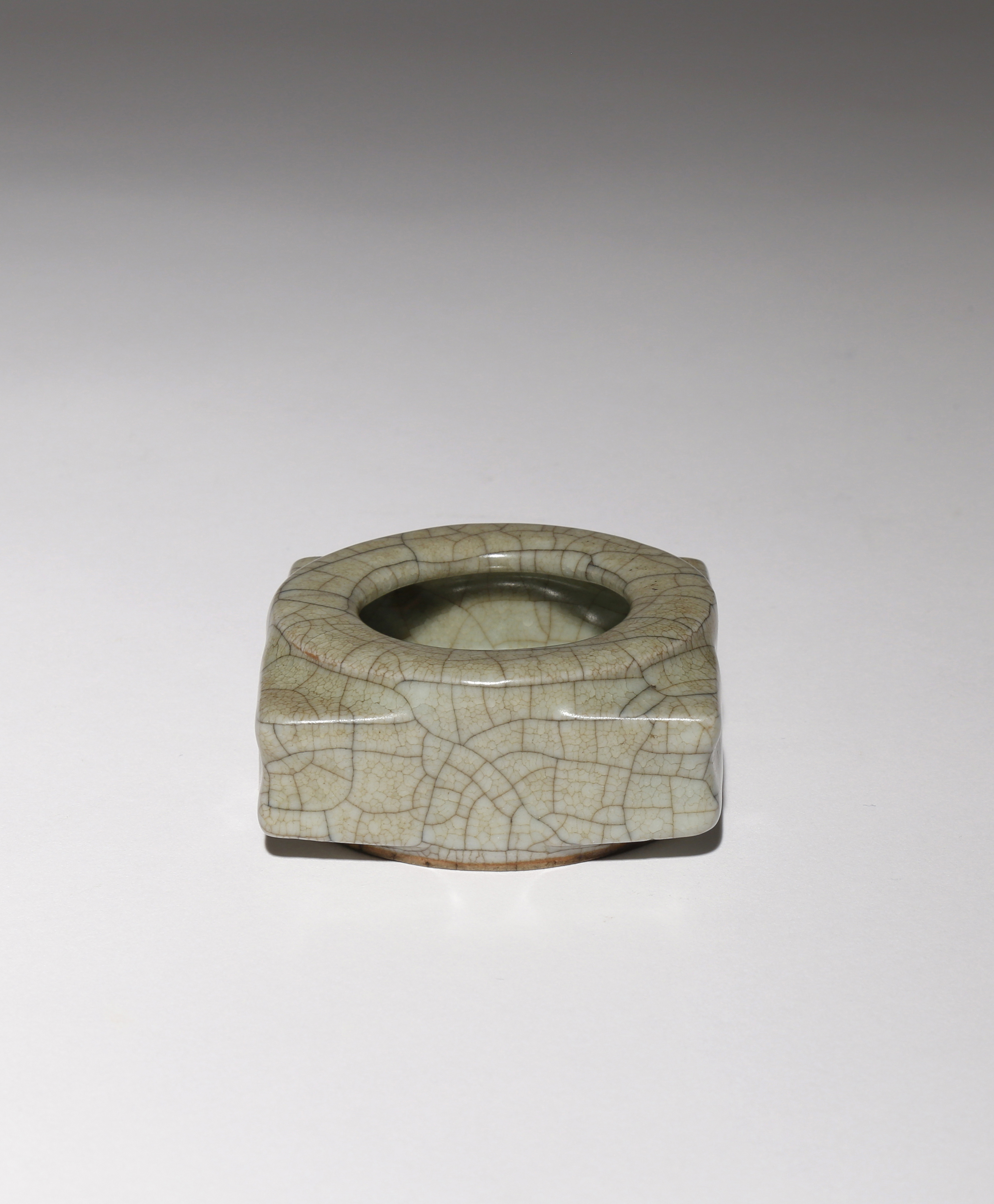 Shaped as a cong, the compressed square-section body surmounted by a circular rim, decorated all over in a greyish glaze with many dark and russet crackles, all supported on a short circular foot, 6.3cm.