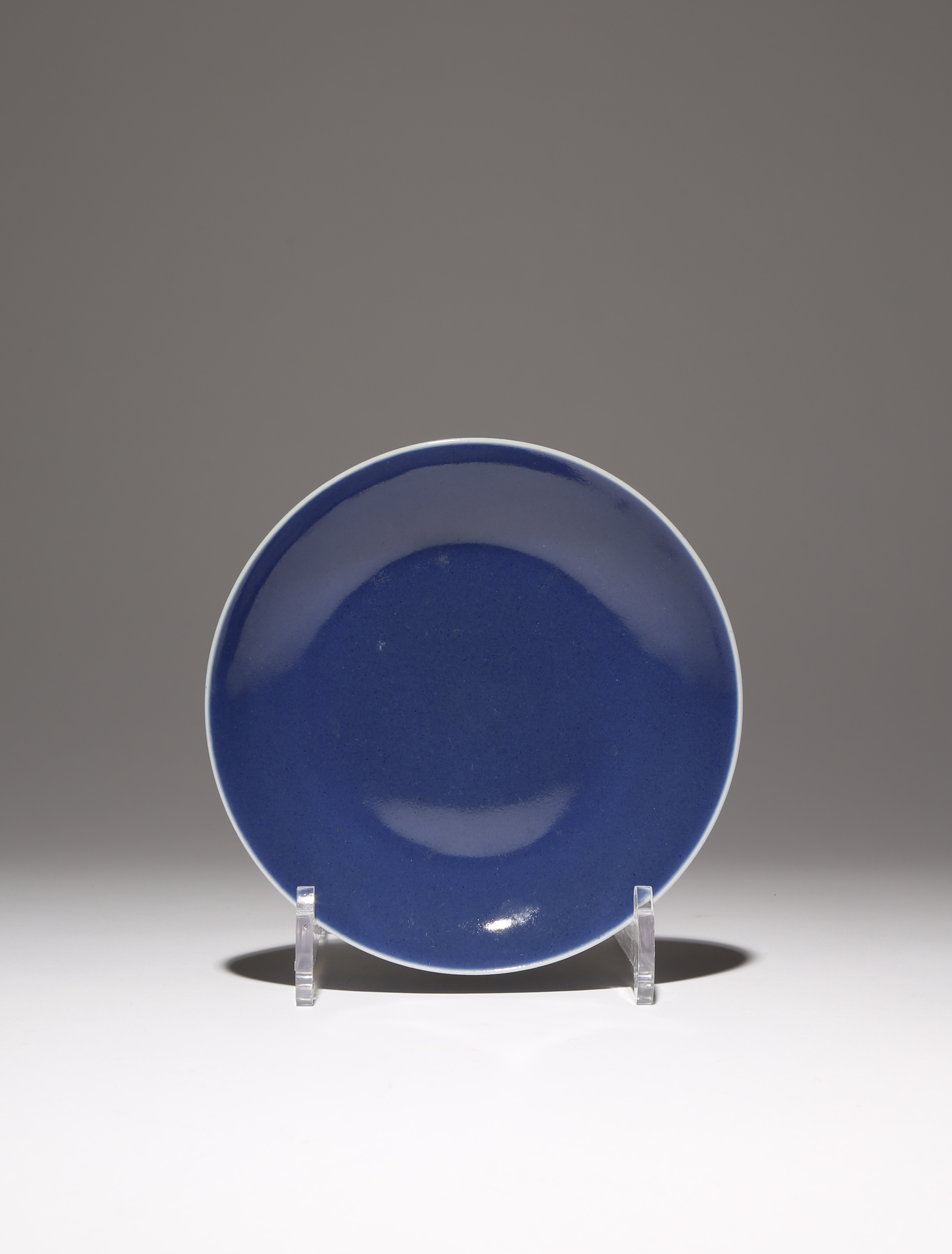 The shallow body raised on a slightly tapering foot, decorated to the interior and exterior with a dark cornflower blue glaze, the rim left white, the white base painted with the reign mark in underglaze blue, 16.2cm.