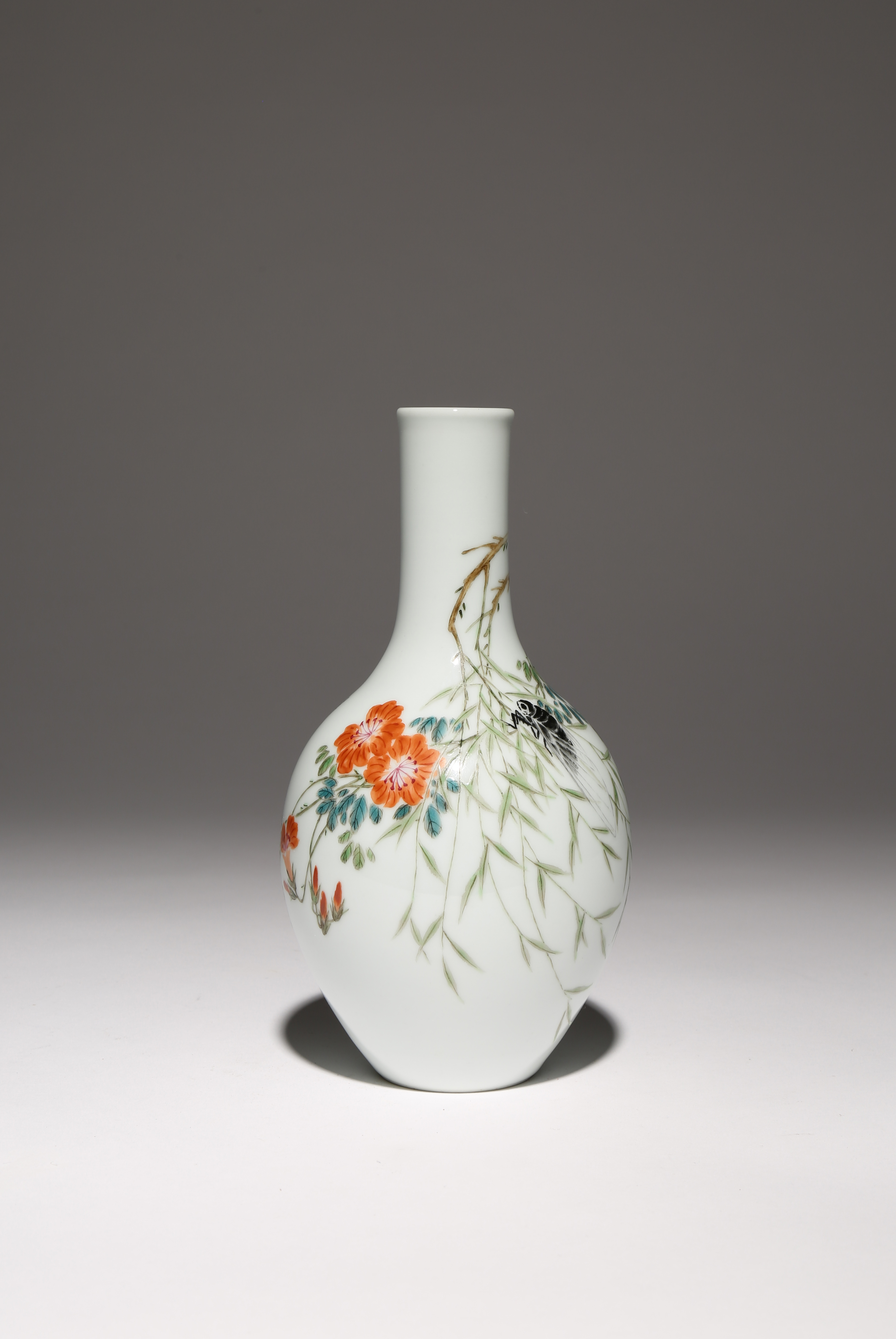 The ovoid body tapering towards the foot and surmounted by a tall cylindrical neck, painted with an insect resting on bamboo amongst blossoming branches, with an inscription to the reverse, dated to summer of the bingzi year, the base with a four character mark reading Jingdezhen zhi, with a paper label for Wain Antiques, 19.7cm.