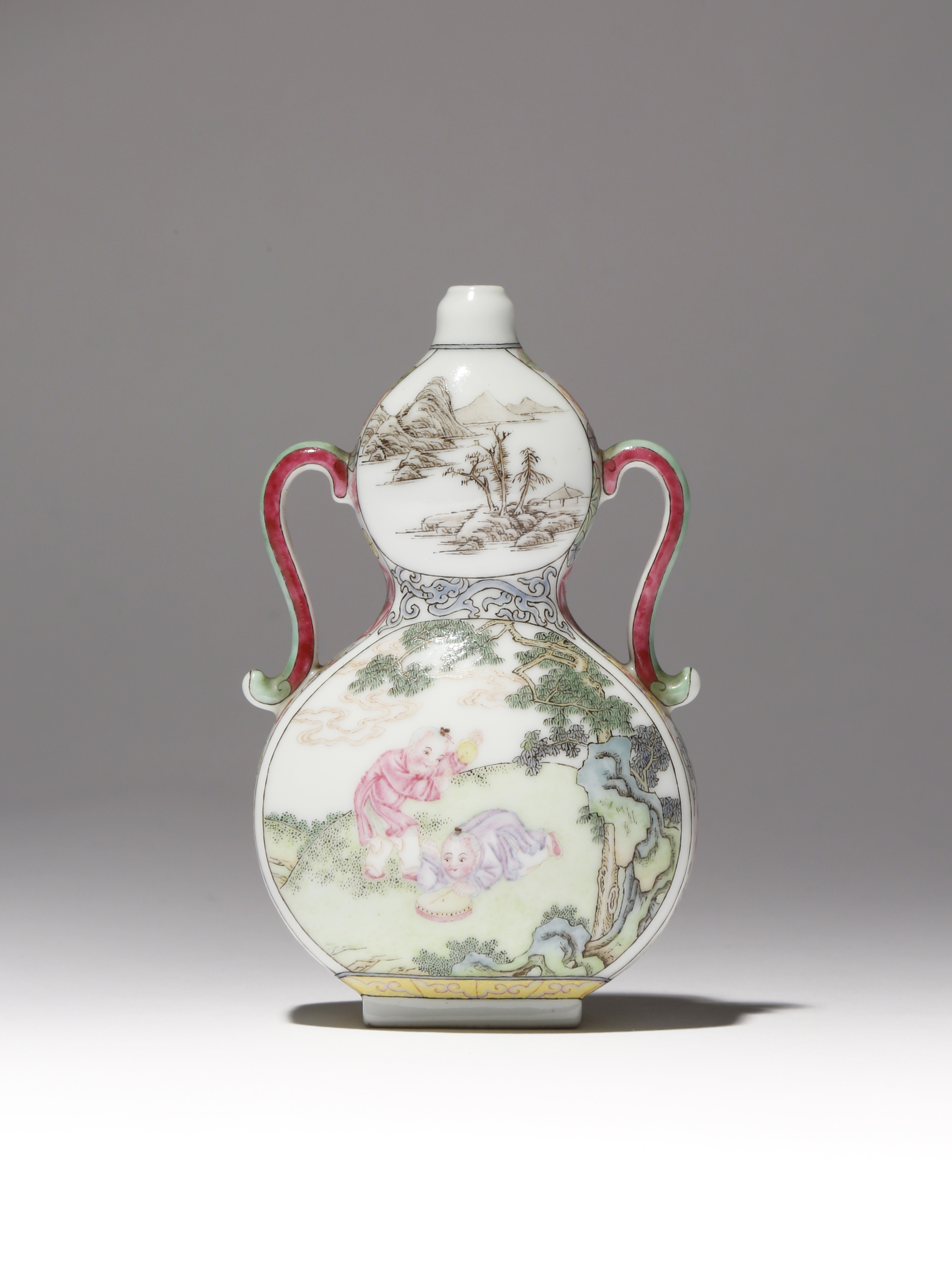 Decorated to each side with a panel enclosing two boys playing in a garden, with roundels painted en grisaille with river landscapes above, the scenes divided by stylised blooms and archaistic beasts, all flanked by two slender strap handles, with a four character Qianlong mark to the base, 10cm.