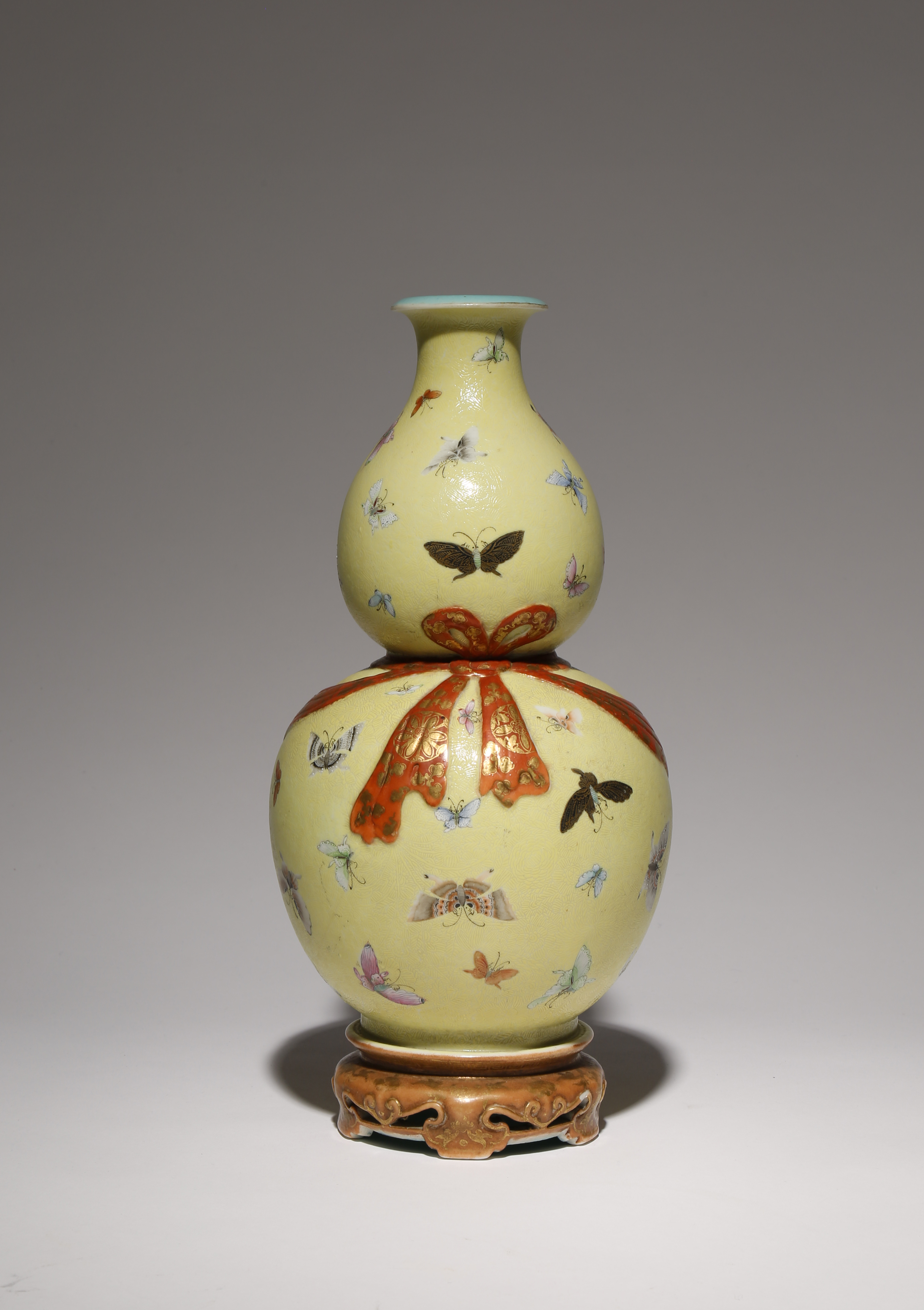 A CHINESE FAMILLE ROSE YELLOW-GROUND GOURD-SHAPED 'BUTTERFLIES' VASE