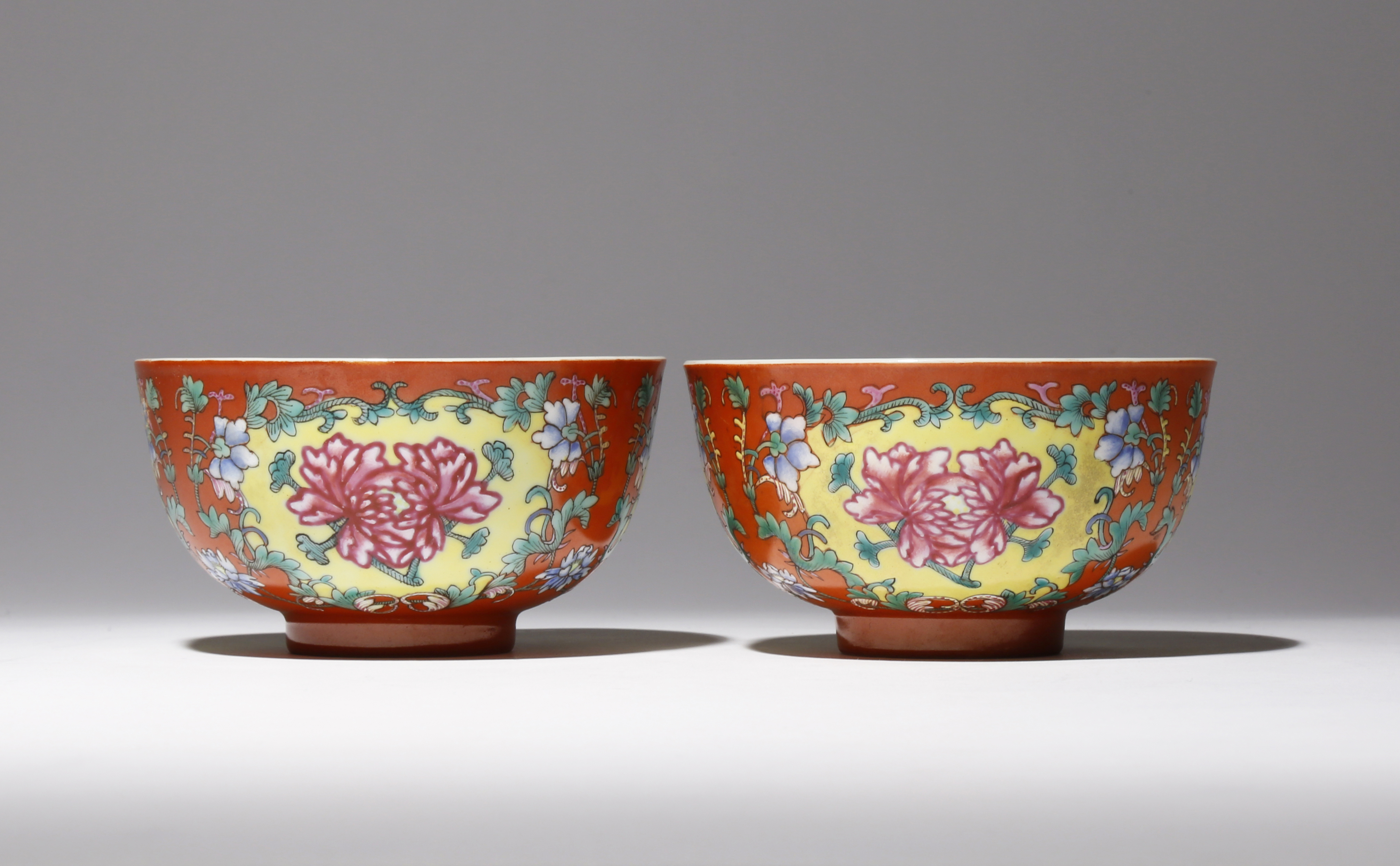 A PAIR OF CHINESE FAMILLE ROSE CORAL-GROUND 'PEONY' BOWLS