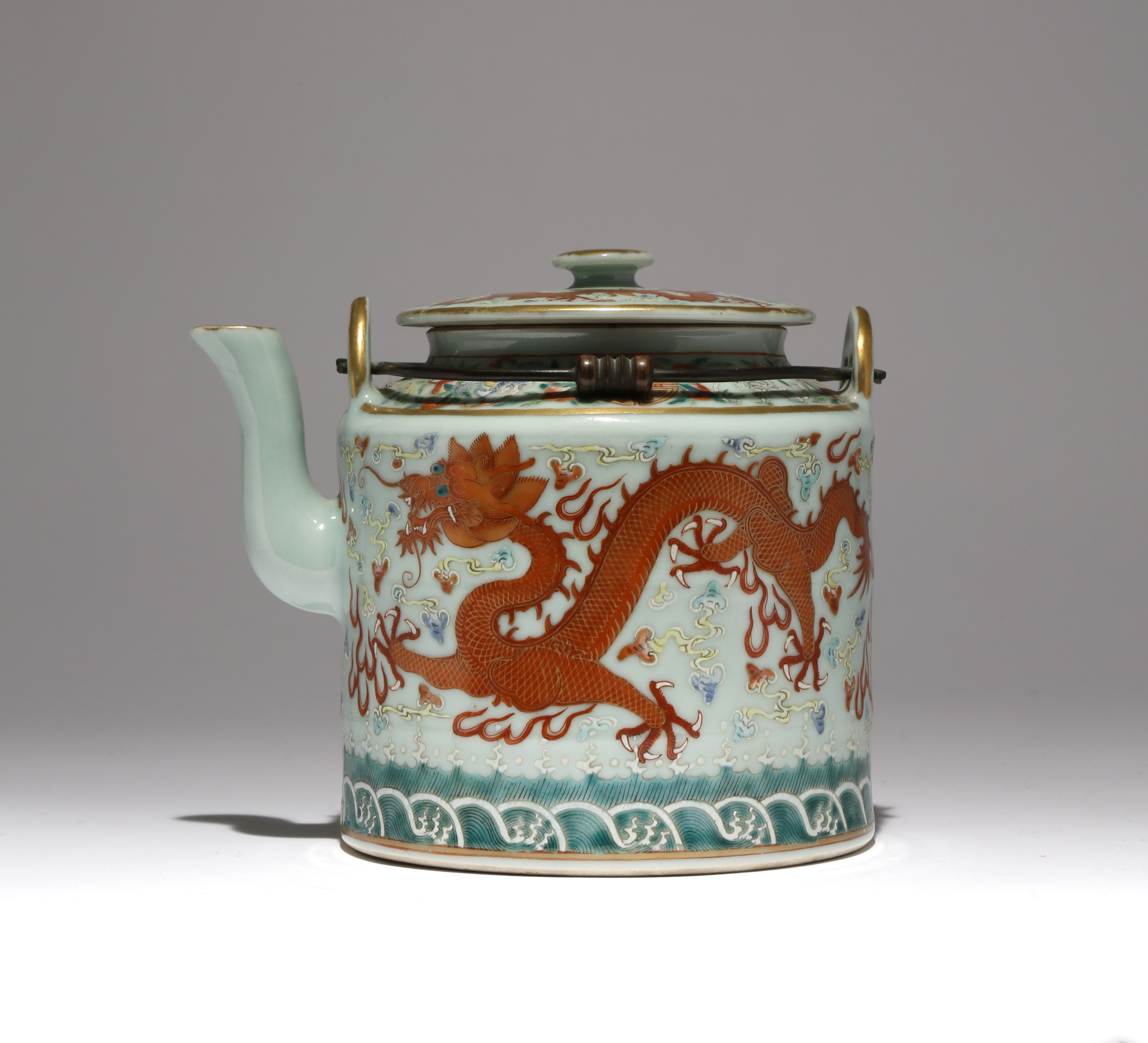 The cylindrical body painted with two iron-red dragons flying over a raging sea, with a band of bats, peaches and shou medallions above, suspended from two metal loop handles, the cover painted with a further two mythical beasts, all reserved on a pale bluish-green ground, the base with a six character Daoguang mark, 17.8cm. (2)