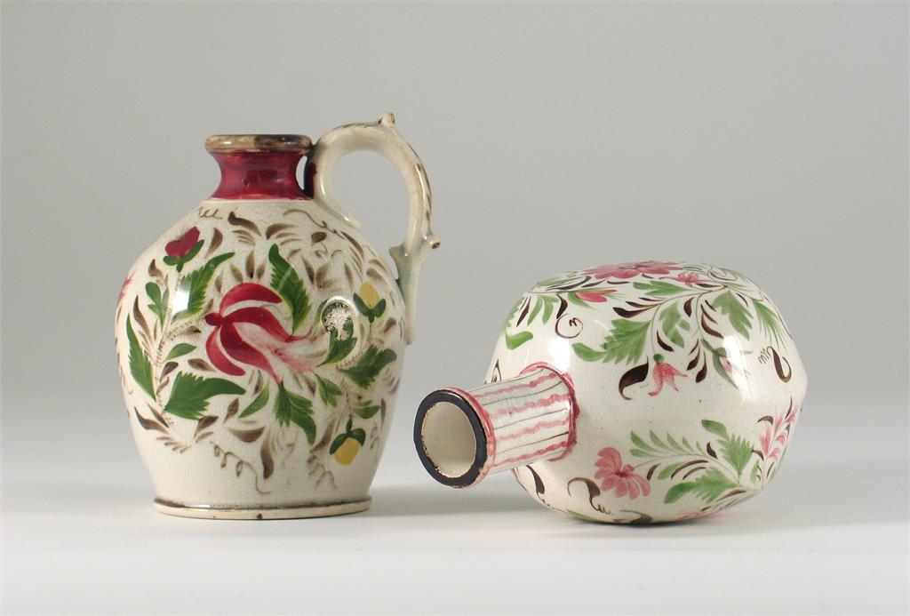 Two small pottery flasks, painted in red, green and brown with stylized flowers, 19th century, 12cm. (2)